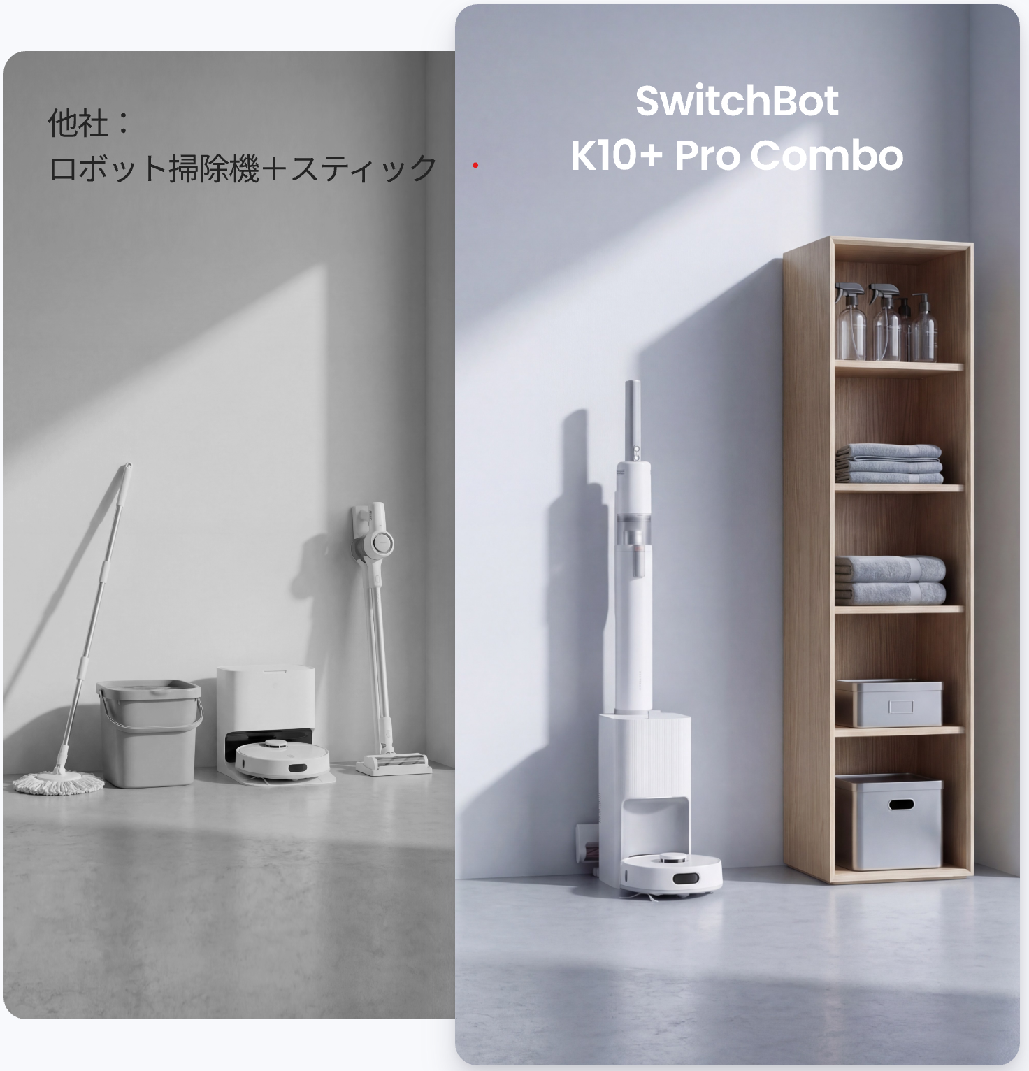 ※SwitchBot自社調べ。ロボット本体とゴミ収集ステーションを含むサイズにおいて、自動ゴミ収集ステーション付きロボット掃除機としては世界最小クラス