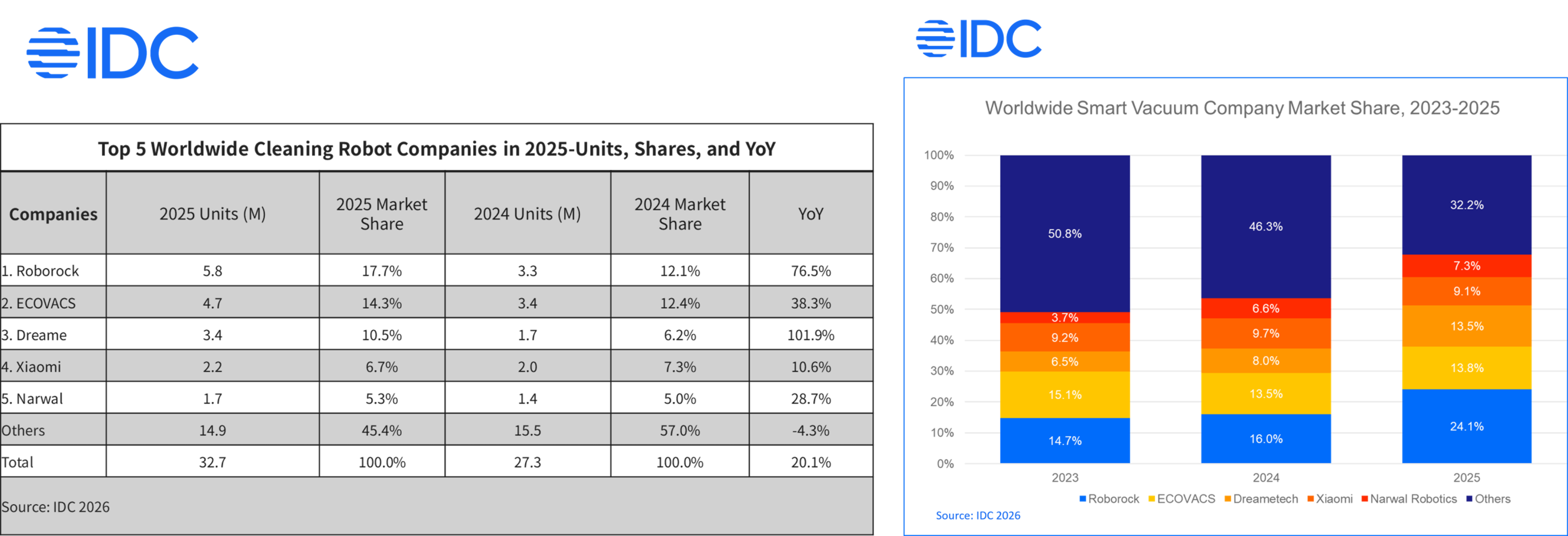 ・IDC Worldwide Quarterly Smart Vacuum Robotics Tracker, 2025Q4(2026年IDC調査)