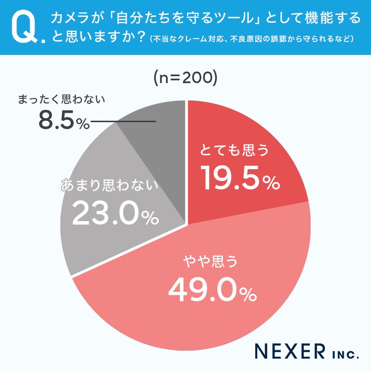 その結果「とても思う」が19.5%、「やや思う」が49.0%となり、合わせると68.5%がカメラを「自分たちを守るツール」として肯定的にとらえていることがわかりました。