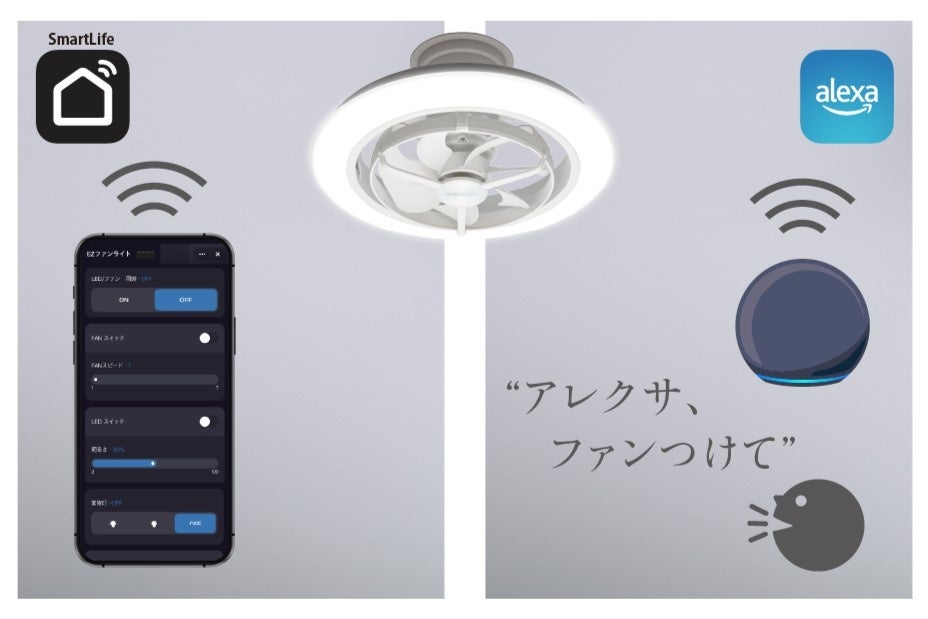 本製品は、サーキュライトシリーズとして初めて「Amazon Alexa」スマートホームアプリ「Smart Life」に対応したモデルです。本体をWi-Fiに接続することで、「Amazon Echoシリーズ」をはじめとするアレクサ搭載デバイスに「アレクサ、ファンつけて」などと話しかけるだけで、ハンズフリーで照明やファンを操作できます。