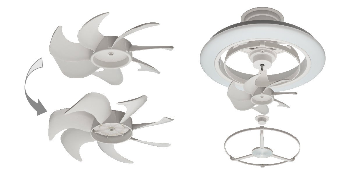 ファン部分の取り外しが可能で、お手入れが簡単です。また、ファンの向きを付け替えることもでき、天井に向けた風、冬におすすめの逆回転の風が強力になり、より空気循環が効率的に行えます。