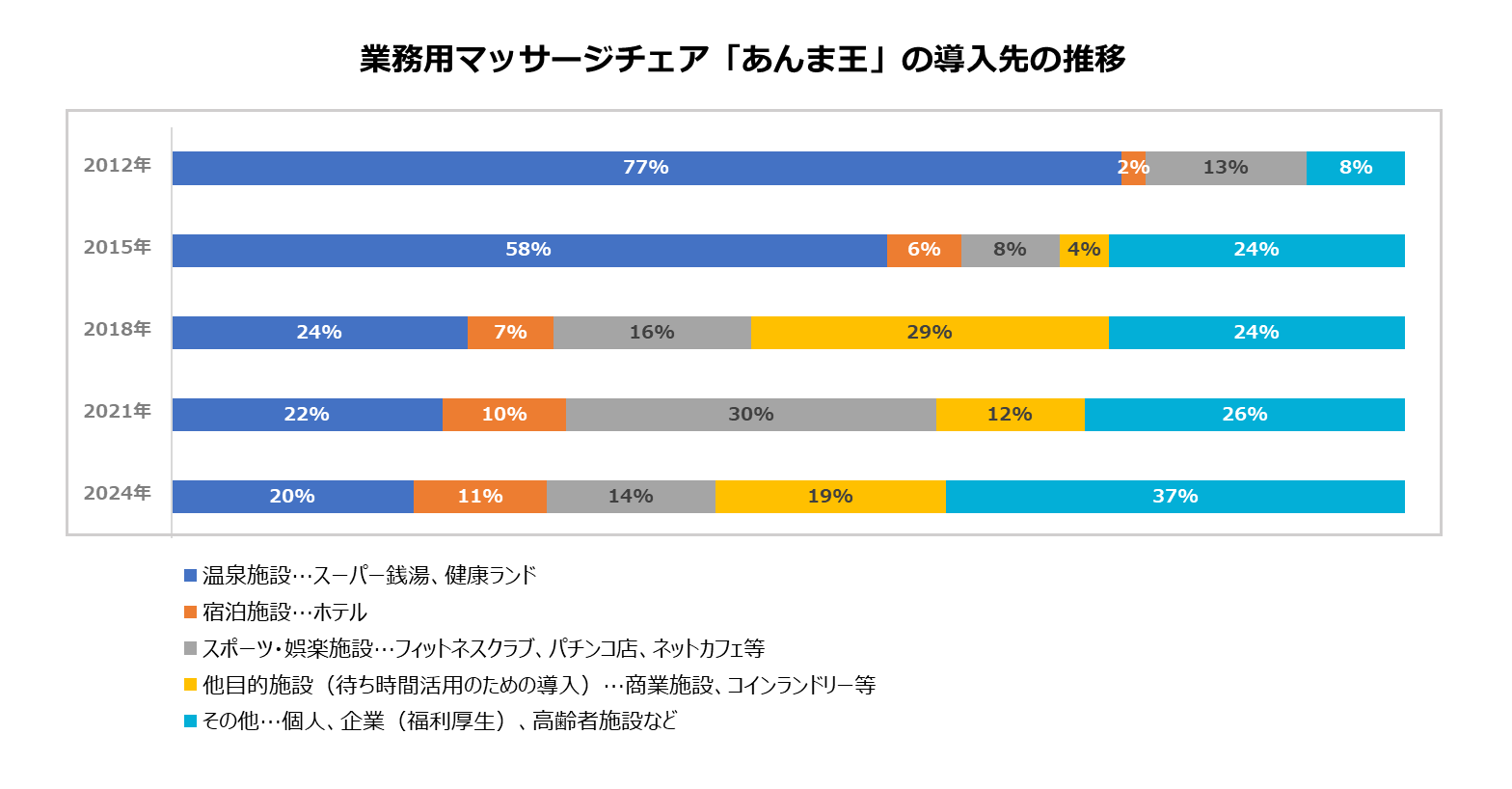 2012年の「あんま王」発売当初、納入先の8割弱が健康ランドやスーパー銭湯などの温浴施設でした。リラクゼーションを目的に訪れる方が多い温浴施設は、マッサージチェアとの親和性も高く、多数導入いただいていますが、近年ではさまざまな生活シーンにその活躍の場を広げています。①待ち時間が発生する施設での時間の有効活用、②施設利用者のリフレッシュ、③空きスペースの収益化 などのメリットから以下のような施設での導入事例があります。