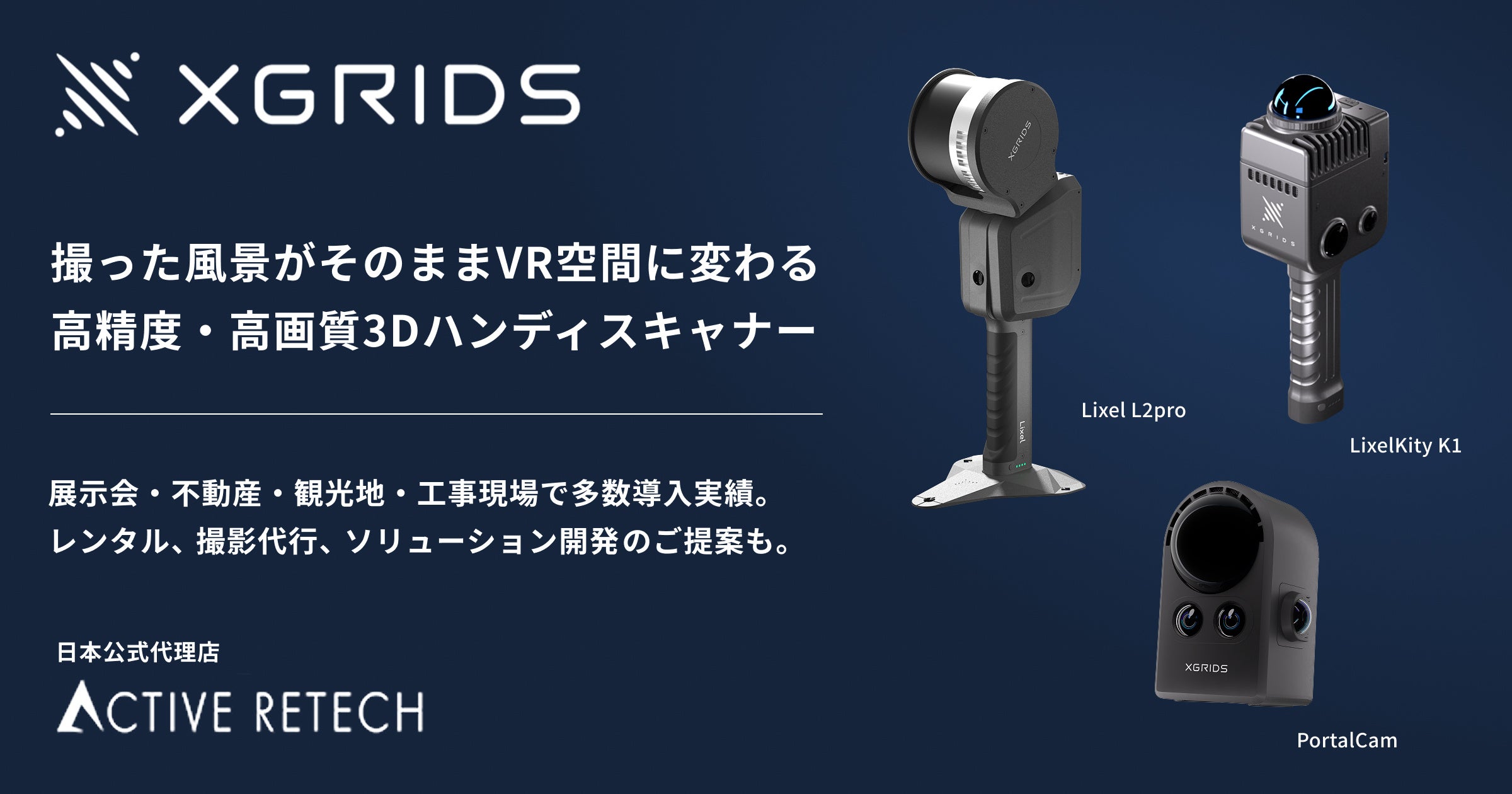 株式会社アクティブリテックは、XGRIDS製3Dスキャナーの日本正規代理店として、PortalCamをはじめとするXGRIDSシリーズの販売・レンタル・技術サポートを手掛けています。また、スキャナーの導入が難しいお客様向けに、アクティブリテックによる代理撮影サービスも提供しており、機材の購入なしに高精度な3Dスキャンデータを取得することが可能です。さらに、unityやUnreal Engineを使ったインタラクティブなVRコンテンツ制作や、システム開発など、お客様のニーズに合わせたカスタマイズ開発にも対応可能です。