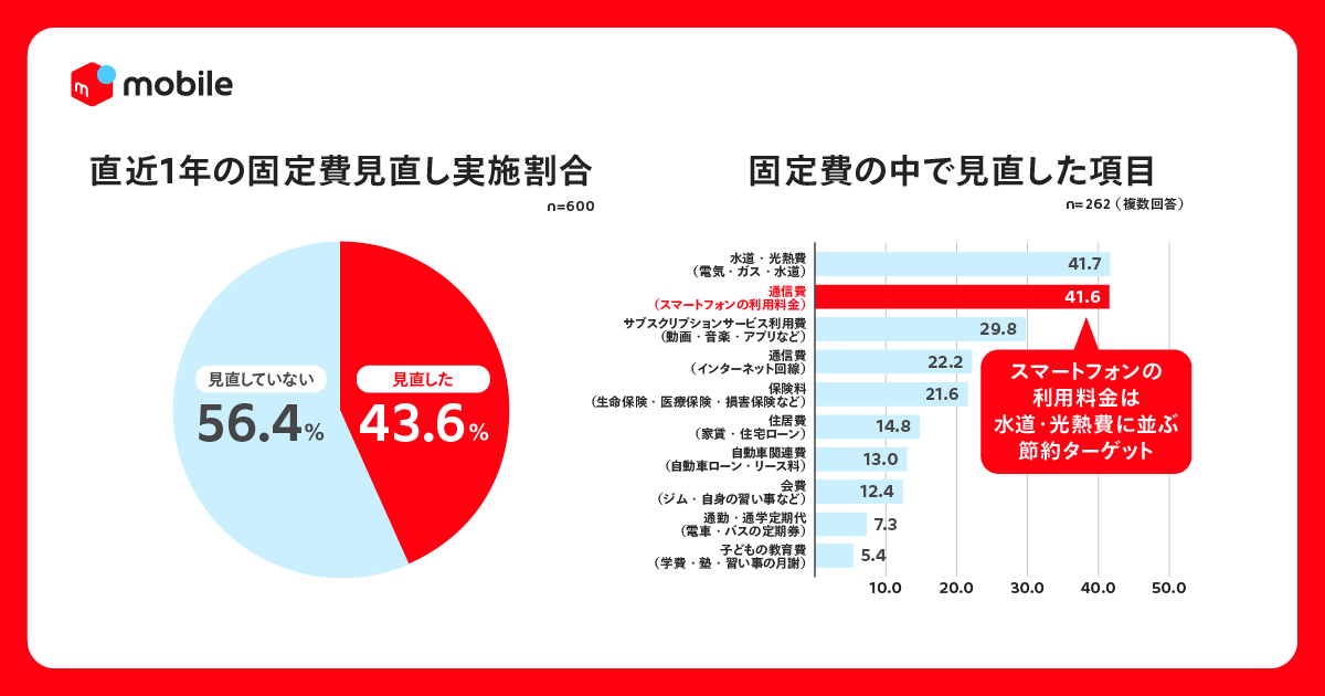 ① 生活者の97.5%が物価高を実感。「固定費見直し」の最優先ターゲットは、「水道・光熱費」に並び「スマートフォン代」も