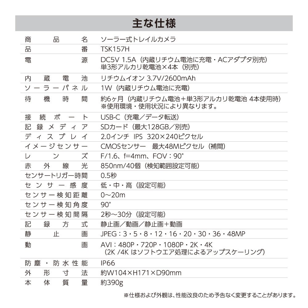 本製品は 人感センサーによる自動撮影、ソーラー充電+乾電池のデュアル電源、IP66 防塵・防水設計を採用し、屋外での長期運用に最適なモデルです。