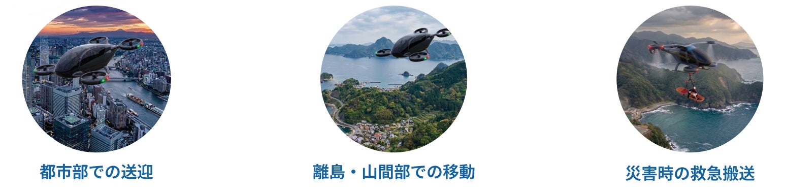 電動垂直離着陸機 (eVTOL) を中心に、誰でも利用できるオンデマンド型の次世代移動手段です。「電動」「自動(操縦)」「垂直離着陸」の特長を活かし、多様なシーンでの空の移動を実現するサービスを目指しています。
