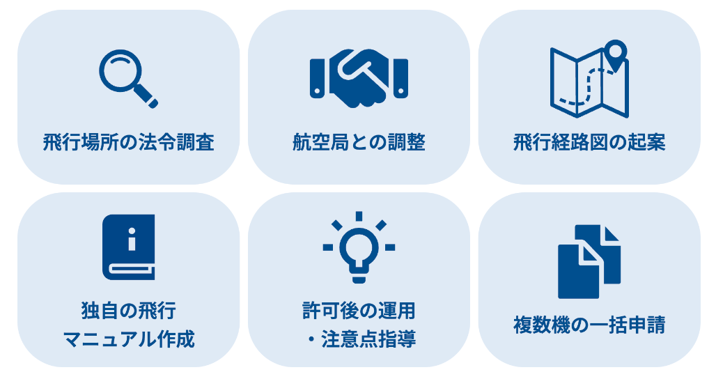 バウンダリ行政書士法人では、無人航空機(ドローン)の許認可サービスにおいて圧倒的な実績を誇っております。多種多様な申請ノウハウをもとに、協力会社やエンドクライアントのご要望を叶える申請内容を提案することが可能。法律を遵守して安全運航を実施するために、様々な調査や調整、許可後の運用アドバイスなど、飛行許可・承認申請の専門チームが手厚く支援いたします。