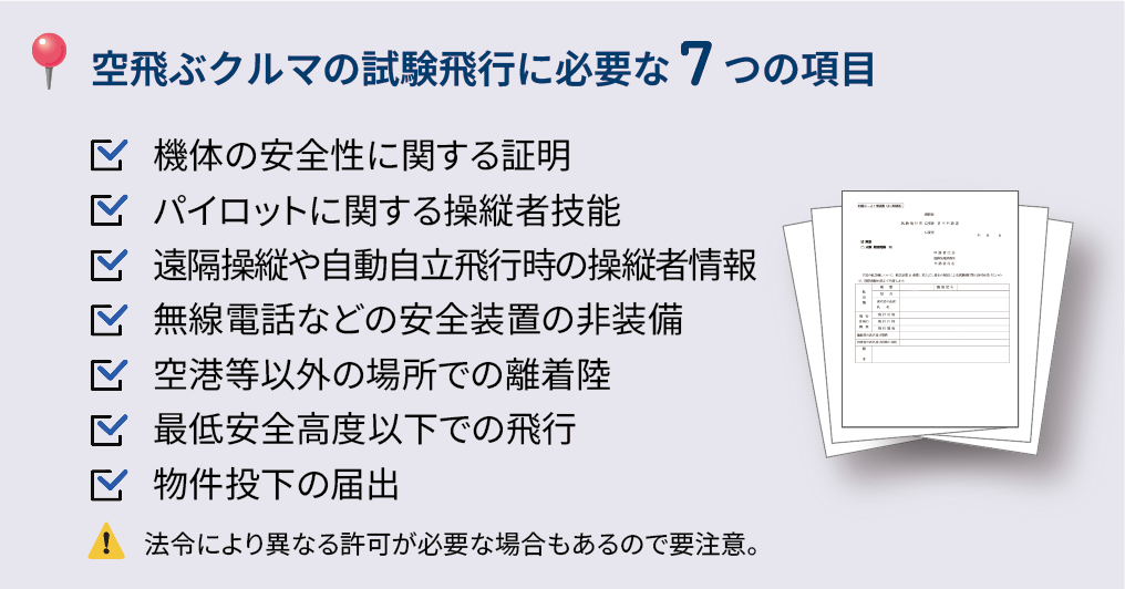 空飛ぶクルマの試験飛行には、航空法に基づく7つの許可取得が必要になります。