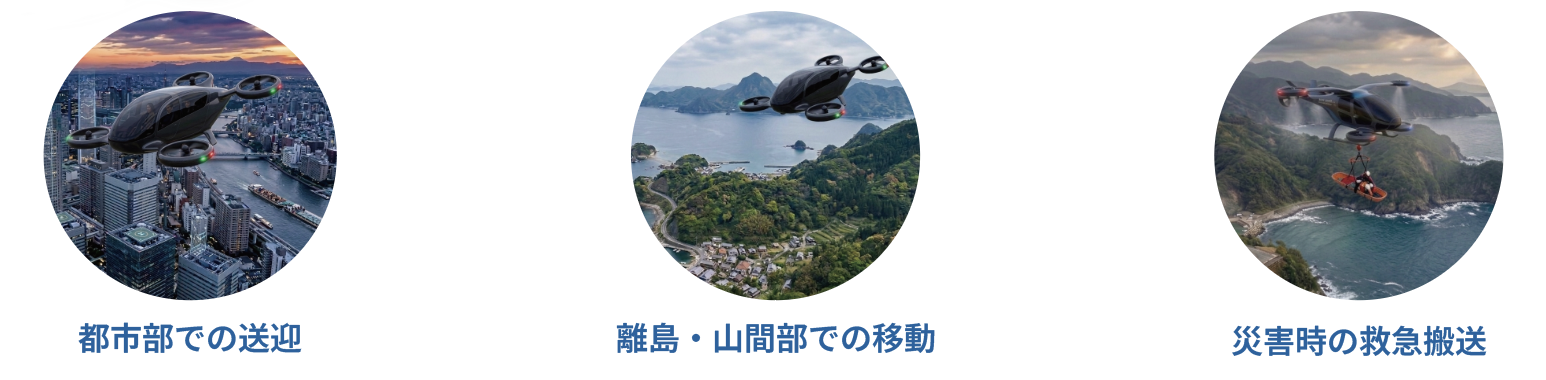 都市部での送迎サービスや離島・山間部での移動手段、災害時の救急搬送などの活用が期待されており、機体の安全性や交通管理などの環境整備が進められています。