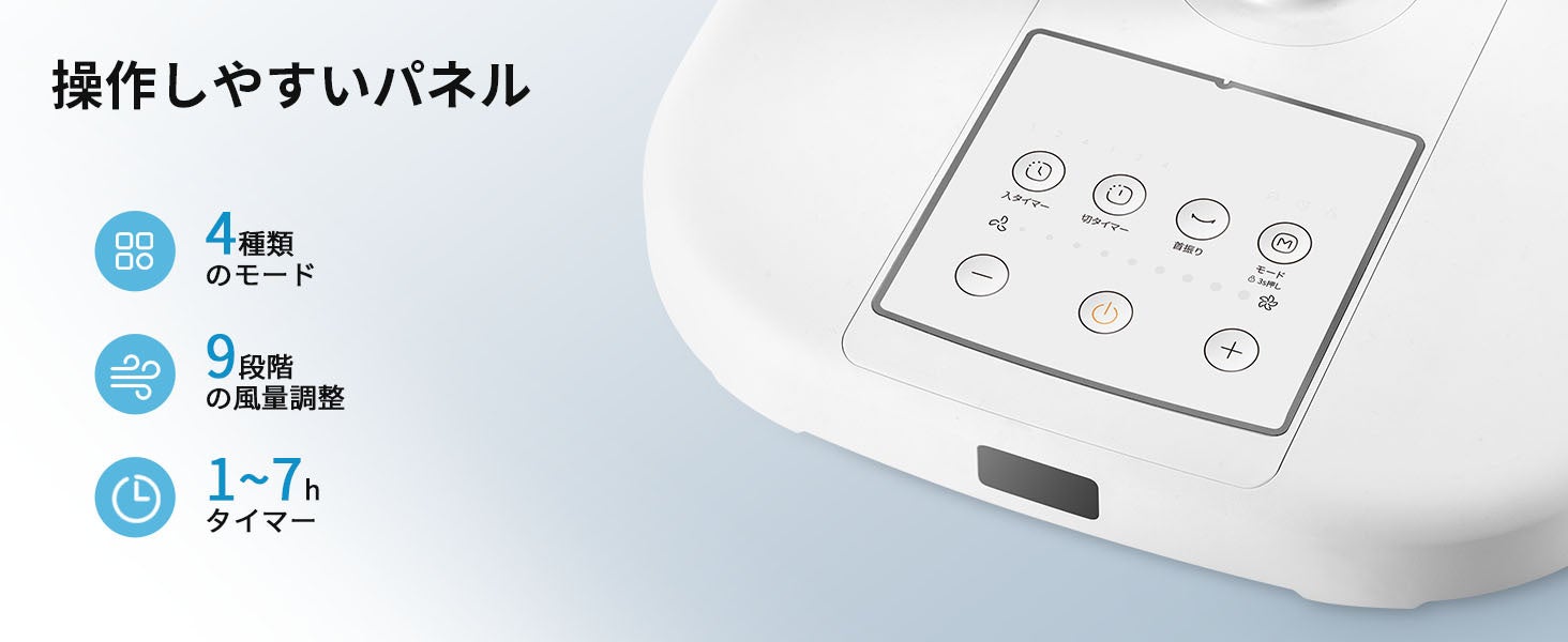 弱・中・強の3段階で風量を調節可能です。お好みに合わせて風の強さを選べます。最大7時間まで設定できる切タイマー機能も搭載し、操作がない場合は自動で電源がオフになり、省エネにも貢献します。