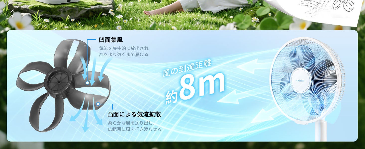 本製品は、クローバー羽の新設計により、より遠くまで届くやさしい風を実現するとともに、静音性と省エネ性にも配慮した設計で、日常のさまざまなシーンにおいて快適な空間づくりをサポートします。