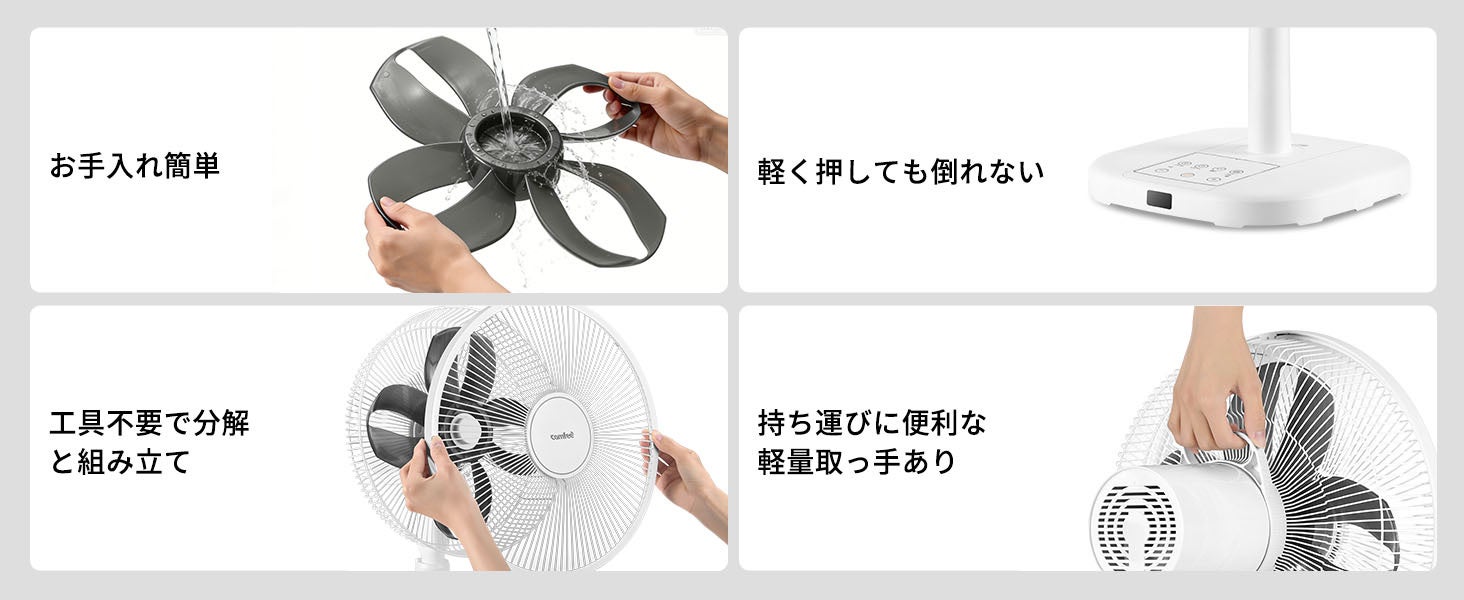 本体は工具不要で簡単に分解・組み立てが可能です。掃除やお手入れも手間なく行えます。持ち運びに便利な軽量取っ手を搭載し、部屋間の移動もスムーズです。さらに、軽く押しても倒れにくい安定設計で、日常の使用でも安心です。
