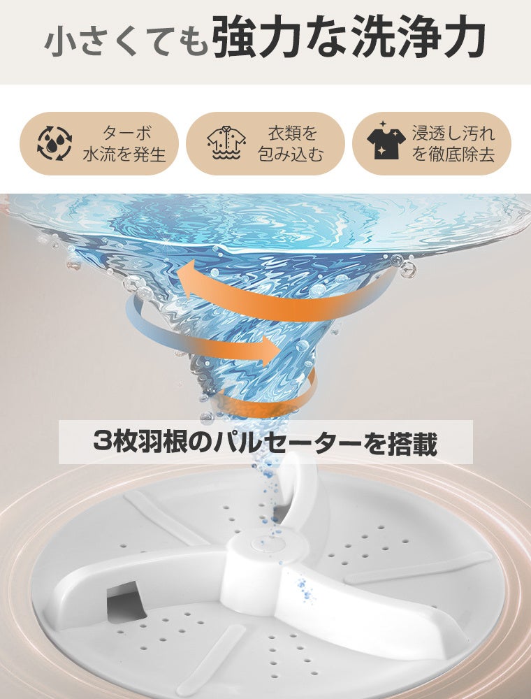 見た目はコンパクトながら、しっかり洗える13Lの大容量設計。タオルや下着、ベビー服はもちろん、ペット用品までまとめて洗えるので、洗濯の回数を減らして家事の負担をやさしく軽減します。一人暮らしや忙しい毎日でも、無理なく続けられるちょうどいいサイズ感です。