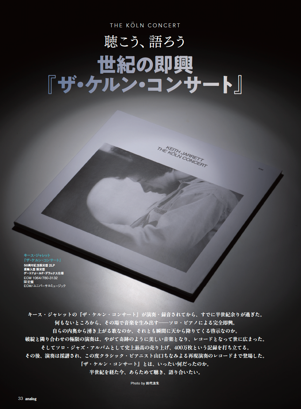 キース・ジャレットの『ザ・ケルン・コンサート』から、半世紀あまりの時が流れました。何もないところから、その瞬間に生み出すソロ・ピアノの完全即興。それが奇跡のように美しい音楽となり、ソロ・ジャズ・アルバムとして史上最高の400万枚というセールスを記録しました。このたび、その演奏を採譜した譜面をもとに、クラシック・ピアニストの山口ちなみが再現作品をリリース。あらためて『ケルン・コンサート』に耳を傾けながら、この作品が私たちにとって何だったのか、そして「即興」とは何かについて、語り合いました。