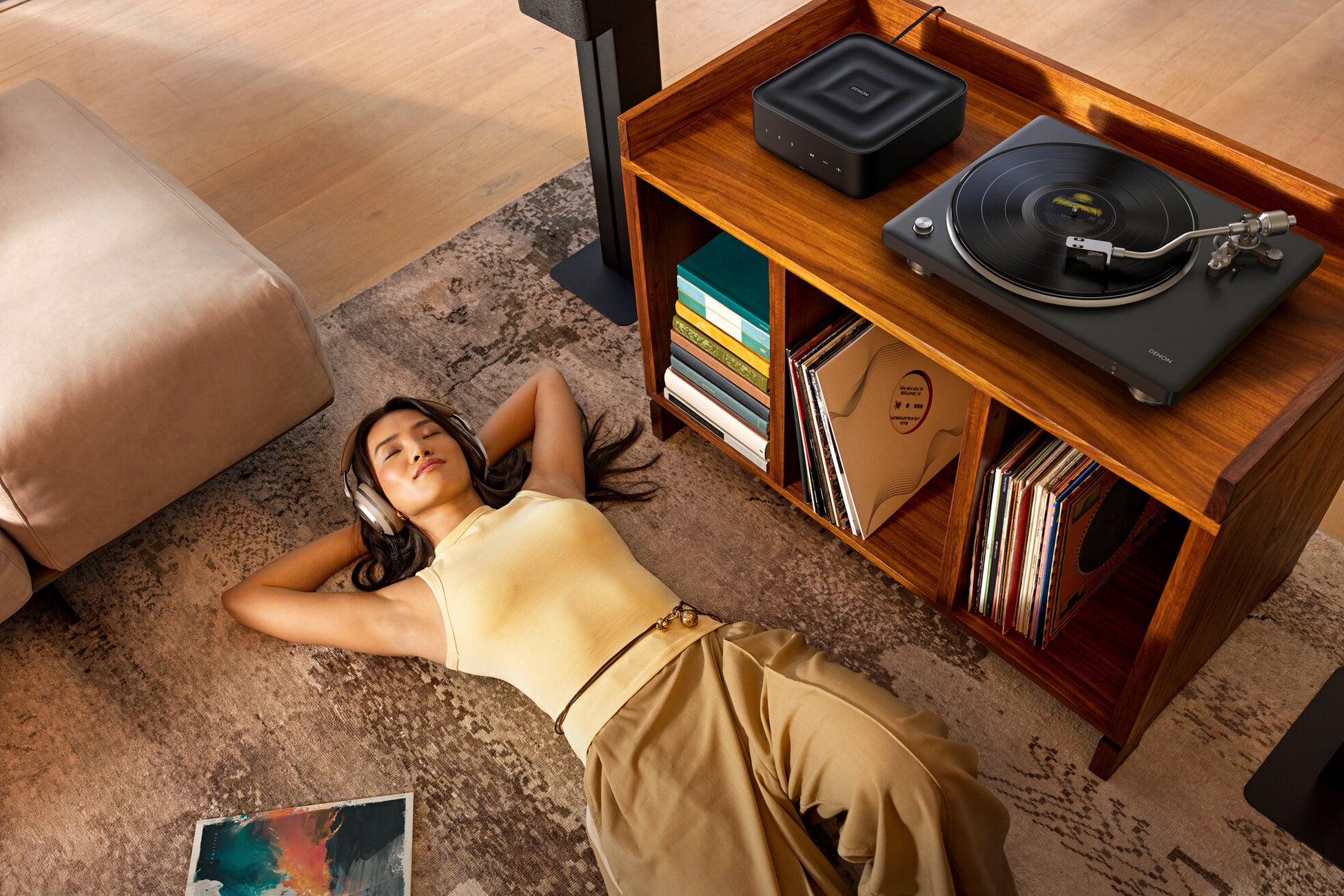 DP-500BTは、デノンの伝統をただ継承するだけの製品ではありません。新たにBluetooth送信機能を搭載することにより、レコードの楽しみ方をさらに発展させるプレーヤーでもあります。単体機やアンプ内蔵のフォノイコライザーに匹敵する高音質を誇る新開発の内蔵フォノイコライザーとaptX Adaptiveなどの高音質なコーデックを組み合わせることで、ワイヤレスでも有線接続に匹敵するクオリティのレコード再生を可能にしました。これによって、レコードプレーヤーと接続するオーディオ機器は、これまでのように並べてレイアウトする必要がなくなります。手元での操作が必要なレコードプレーヤーは近くに置き、コンポやスピーカーは離れた場所に配置することも可能です。もちろんBluetooth対応のイヤフォンやヘッドフォンでレコードを楽しむこともできます。音量調整はDP-500BTのフロント右側のボタンからでも、接続したオーディオ機器からでもできるため、音量調整機能を持たない完全ワイヤレスイヤフォンのような機器でもお使いいただけます。
