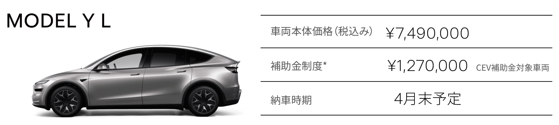 【注意事項】1. 全国の急速充電設備 テスラ スーパーチャージャーの利用が対象となります。その他の充電設備での充電や駐車場代などは対象外となります。また、充電終了後に発生した超過料金については本キャンペーンの対象外ですのでご注意ください。2. 燃料代節約の試算は、ガソリン価格194円/L、燃費20km/Lと仮定した上で行っています。3. すべての充電をスーパーチャージャーにて行ったものと仮定した場合の数値です。4. 本キャンペーンが適用されるのは、当社が販売する指定車両に限ります。本特典はお客様のテスラアカウントと連動しており、第三者や、その他の車両に譲渡することはできません。また、中古車および業務目的(タクシー、ライドシェア、デリバリーサービスなど)に使用される車両は本キャンペーンの対象外です。5. ご注文日や登録手続き、車両準備などに要する時間によっては期限内に納車ができない場合がございます。当社は当該期日までに納車を完了することを保証いたしません。理由の如何を問わず、期日を過ぎた後の納車には本キャンペーンは適用されませんので予めご了承ください。2026年1月1日から2026年3月31日まで実施した「特別金利キャンペーン」が適用される未納車のご注文をお持ちの場合、その注文をキャンセルして本キャンペーン適用となる注文を入れることはできません。2025年12月31日までの未納車のご注文をお持ちの場合、その注文をキャンセルして本キャンペーン適用となる注文を入れることはできません。本キャンペーンは 予告なく変更又は終了する場合がありますので、予めご了承ください。6. 本補助金制度は予算がなくなり次第終了となります。対象となる車両の登録期間は、2026年4月1日~2027年初旬(終了日未定)です。詳しくは次世代自動車振興センターのウェブサイトをご覧ください。