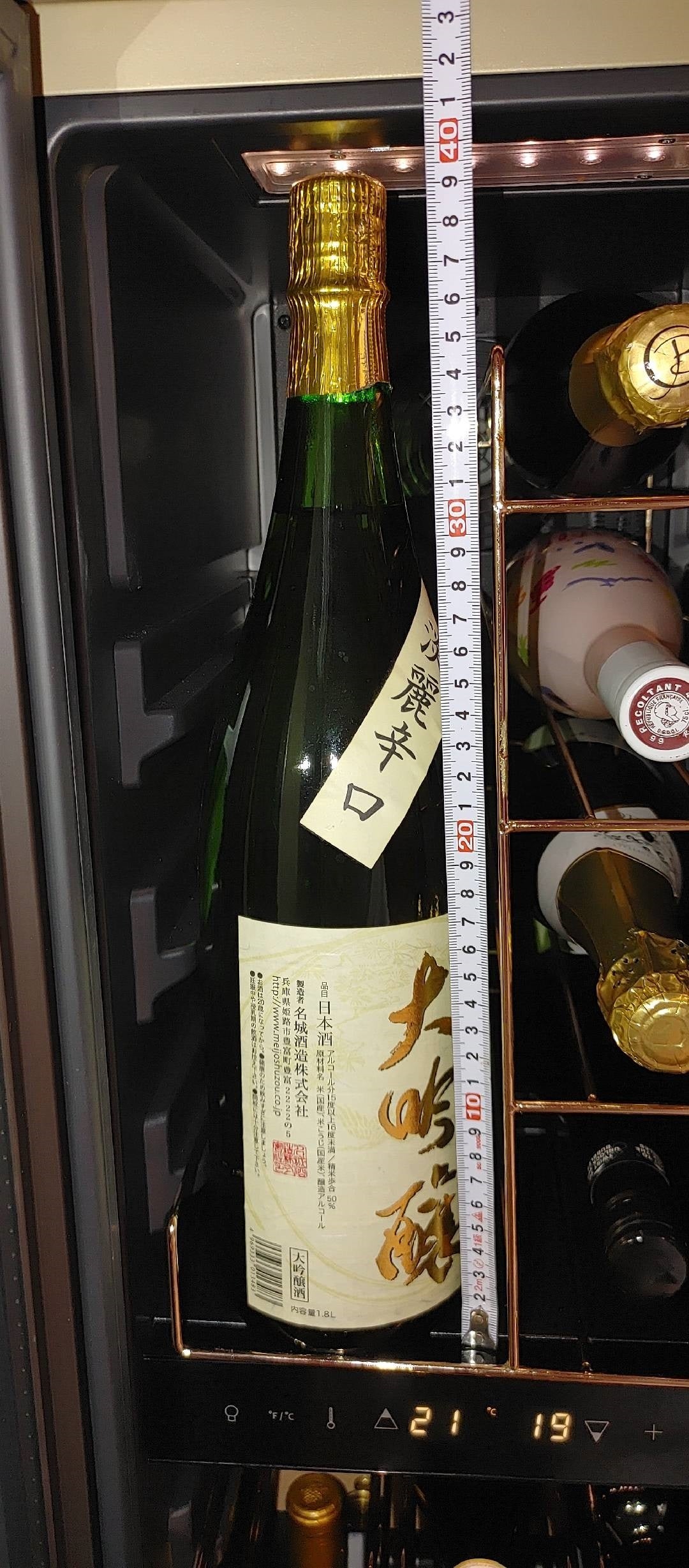 上室の左には一升瓶を縦置き、右のラックにはシャンパンを寝かせて静かに保管できます。