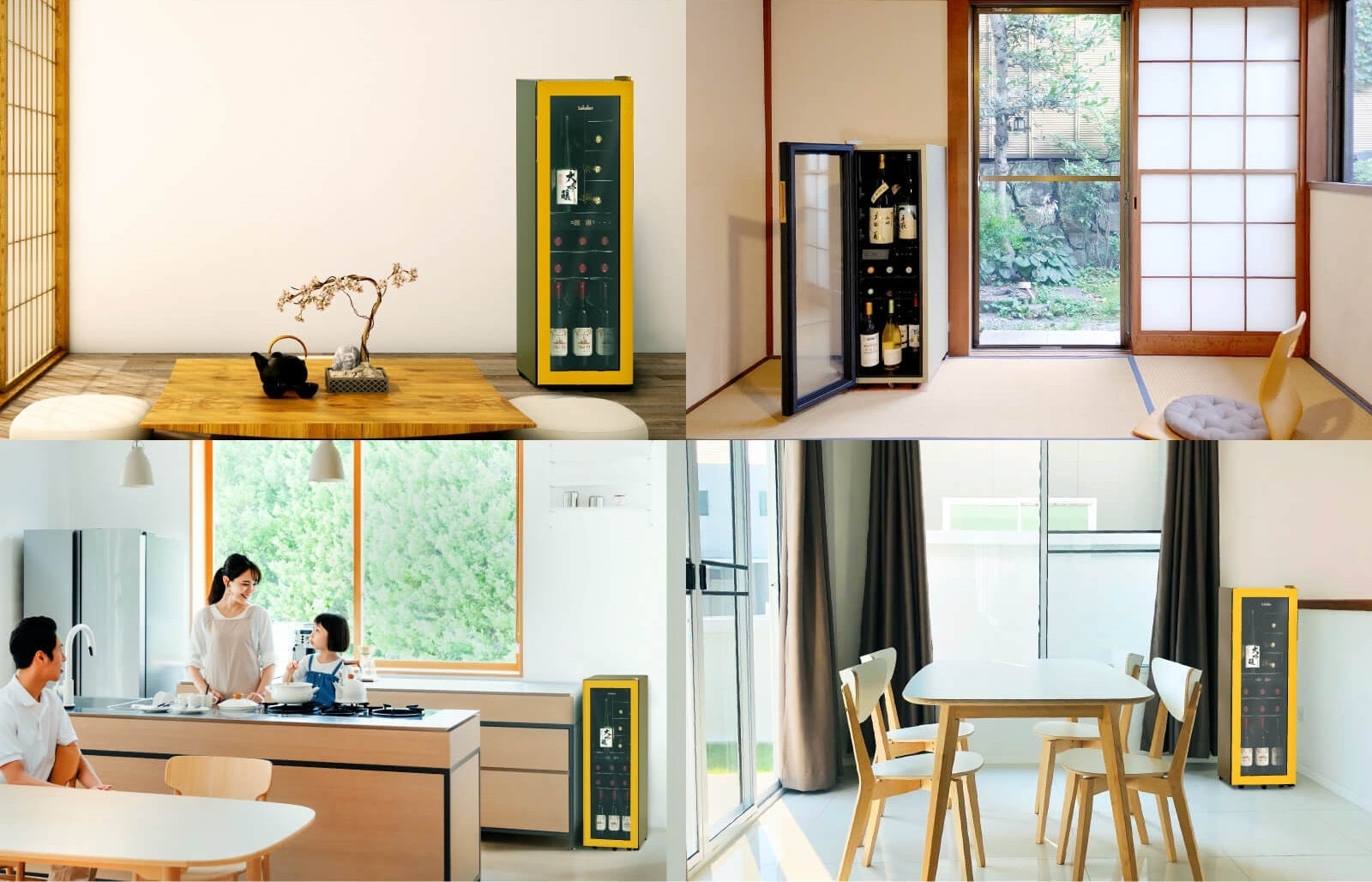 『サカリュエ』は和の空間にも馴染む山吹色のフレーム。上下2温度管理の『潤金』は、日本酒も赤ワインも最適な温度で保管できる。