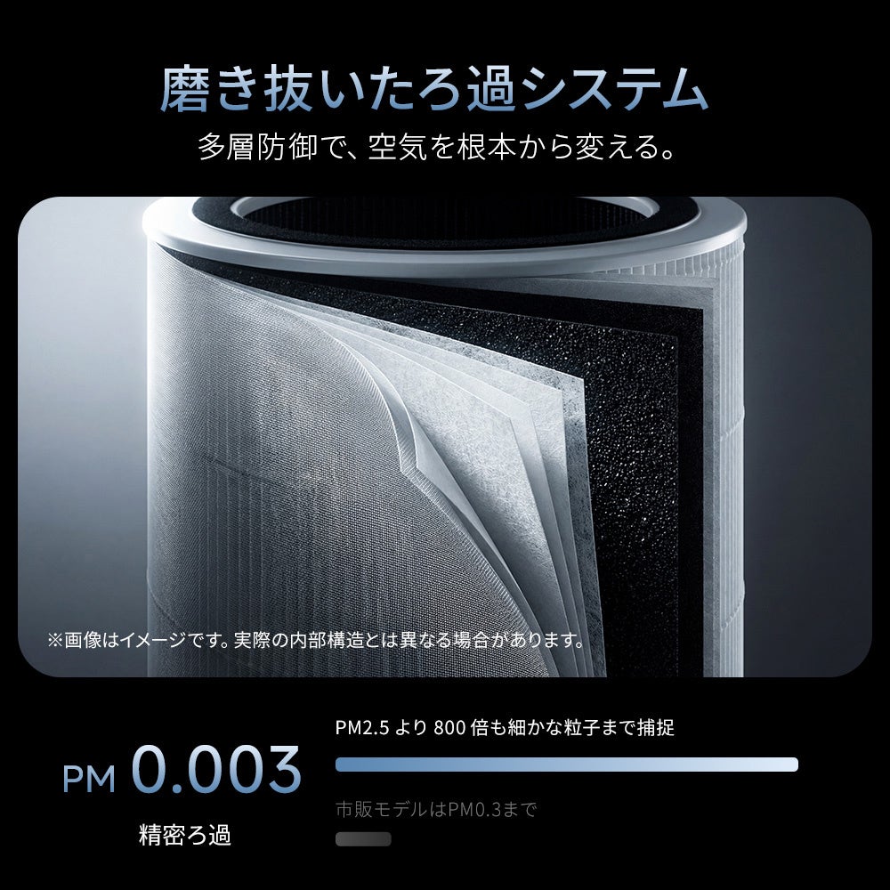 一般的な空気清浄機の捕集性能は0.3~0.1μmが主流とされる中、Ultra S7はその約100倍微細な0.003μm——PM2.5のわずか800分の1にあたる超微細粒子まで捕集できる設計を採用。