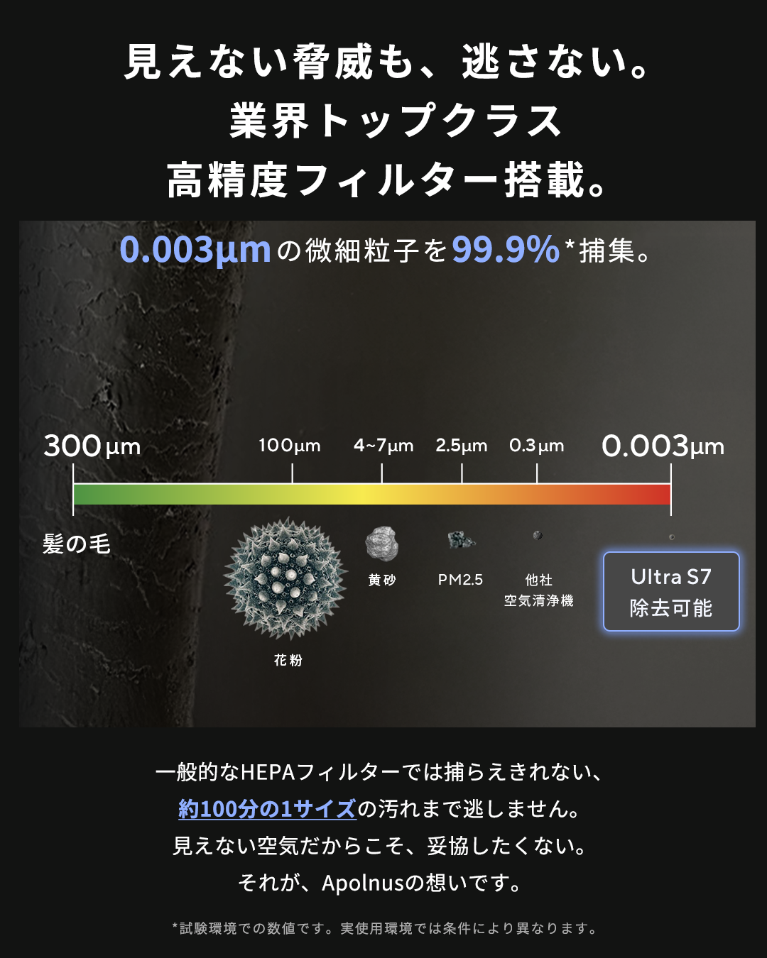 一般的な空気清浄機の捕集性能は0.3~0.1μmが主流とされる中、Ultra S7はその約100倍微細な0.003μm——PM2.5のわずか800分の1にあたる超微細粒子まで捕集できる設計を採用。