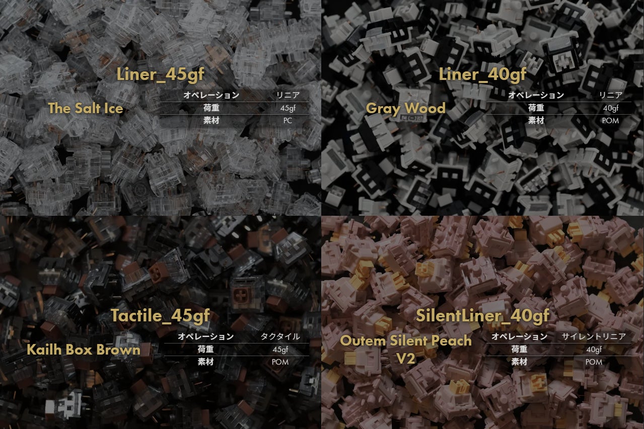 • スイッチの選択と交換:購入時に4種類のキースイッチから選択可能。ホットスワップ仕様のため、購入後もはんだ付け不要でキースイッチの交換に対応。
