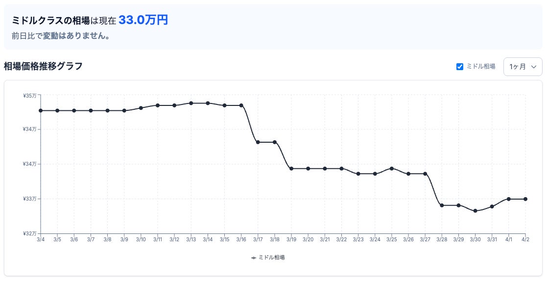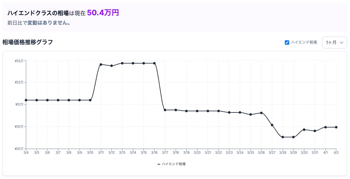 2月は「値上がりが止まっただけで、相場のベースラインは高いまま」という状況でしたが、3月はそこからさらに一歩進み、セールや販売調整による実質的な値下げが相場に反映された月だったと言えます。これまで相場上昇を牽引していたハイエンド帯まで明確に下落へ転じた点は、市場の過熱感がやや落ち着き始めたサインとして注目すべき動きです。