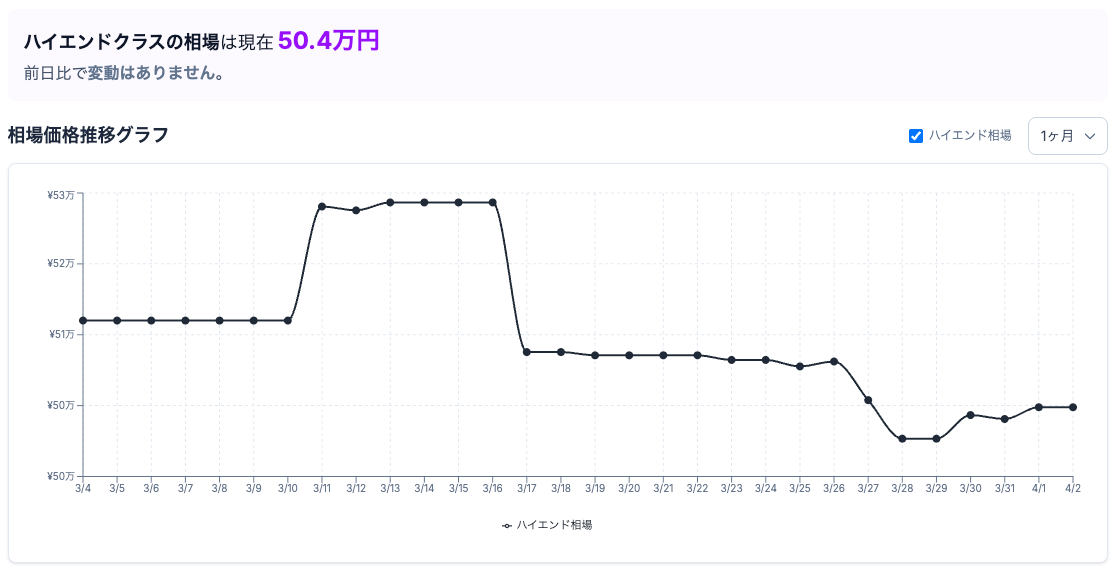 ハイエンド帯の人気構成でも、3月は値下がり方向の動きが確認されており、相場全体がやや調整局面に入っていることがうかがえます。