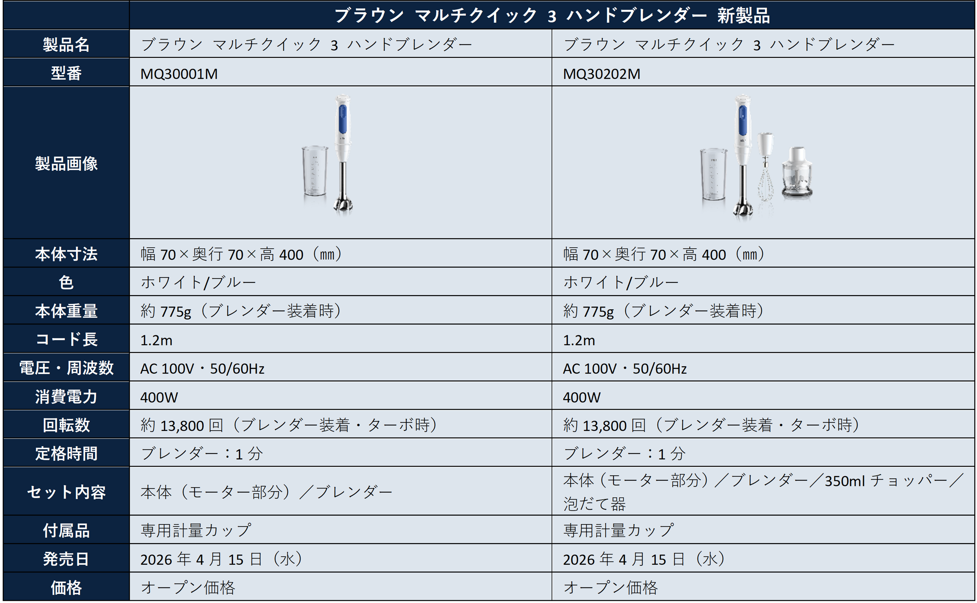 デロンギ・ジャパン株式会社(本社:東京都港区 代表取締役社長:甲斐ラース)は、市場シェアNo.1※1のハンドブレンダーブランド「ブラウン ハウスホールド」より、新製品「ブラウン マルチクイック 3 ハンドブレンダー(MQ30001M・MQ30202M)」(以下、マルチクイック 3(MQ30001M)、マルチクイック 3(MQ30202M))の2モデルを2026年4月15日(水)より発売します。
