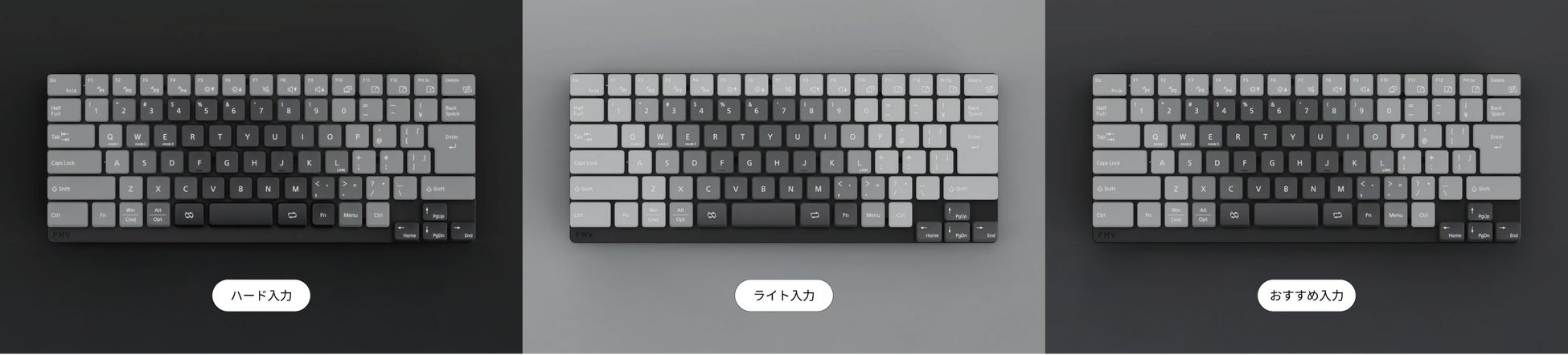FMVキーボードマイスター監修の3種類のアクチュエーションプリセットを搭載しています。「ライト入力設定」では軽い力で素早く入力、「おすすめ入力設定」ではFMVノートパソコンと同様の押下圧、「ハード入力設定」では深く押し込んで確実に入力と、お好みの打鍵感をお選びいただけます。