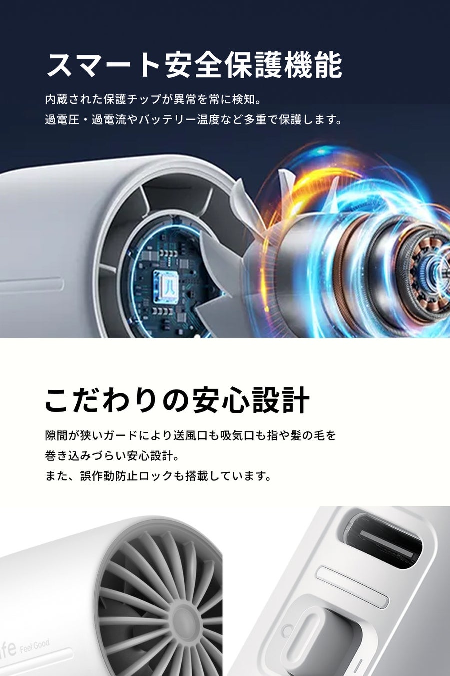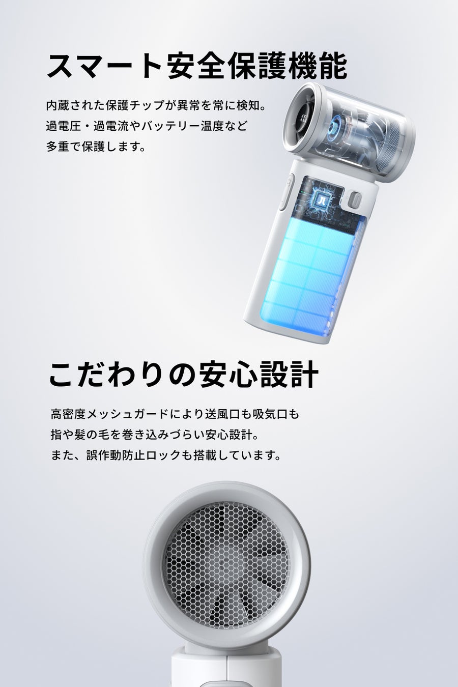 高密度メッシュガードにより指や髪の毛を巻き込みづらい安心設計。また、誤作動防止ロックも搭載しています。