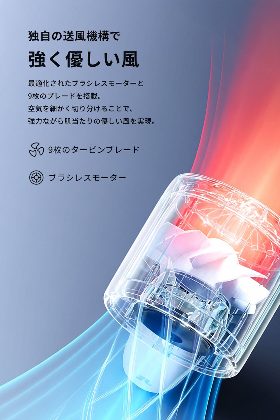 最適化されたブラシレスモーターと9枚のタービンブレード(羽根)を搭載。空気を細かく切り分けることで、強力ながら肌当たりの優しい風を実現。