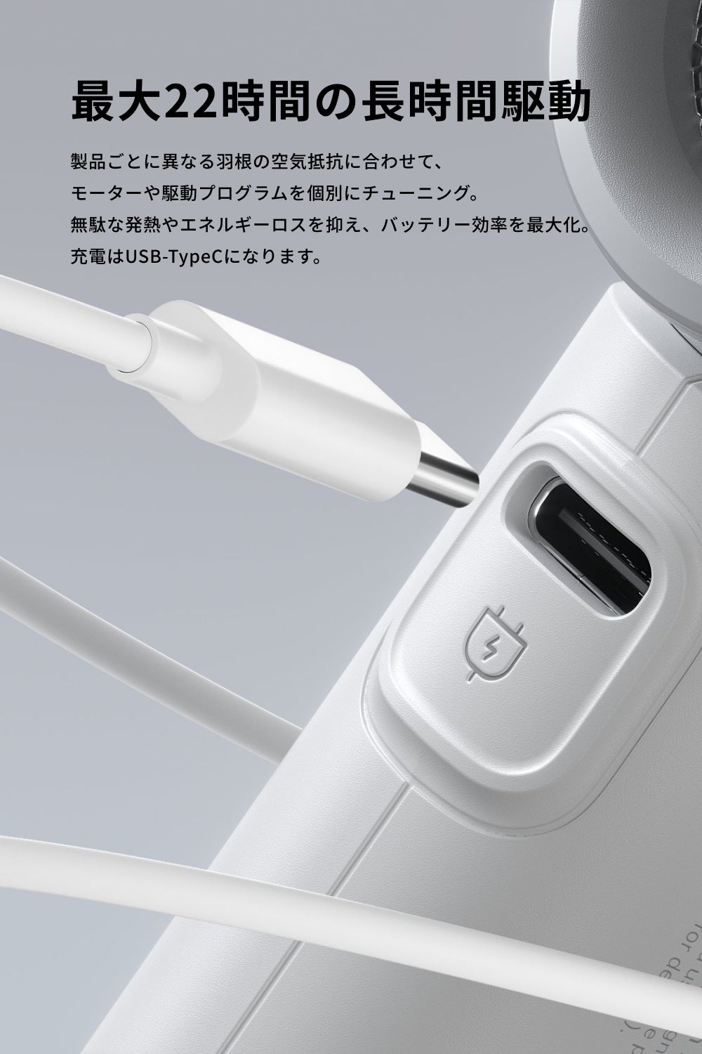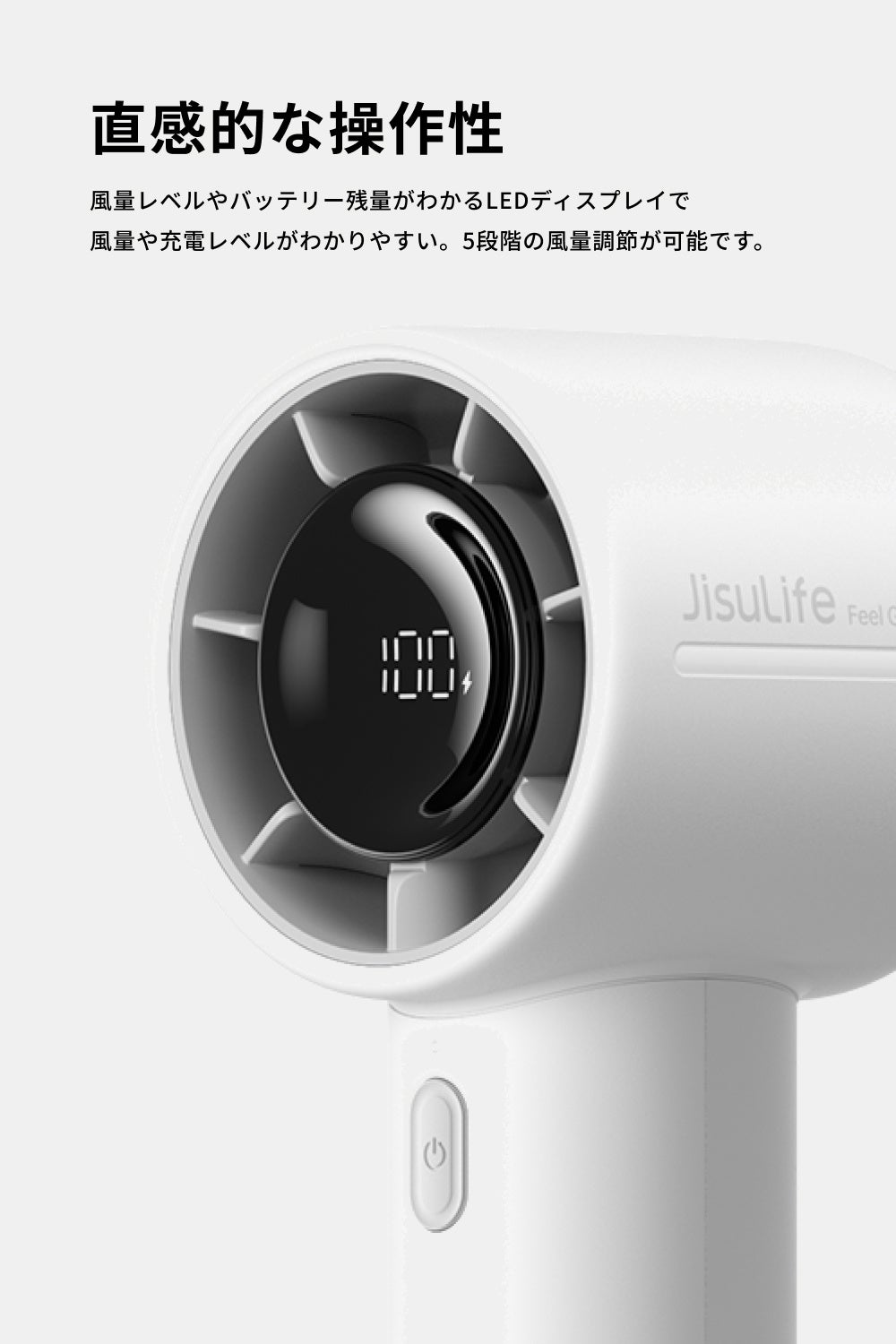 風量レベルやバッテリー残量がわかるLEDディスプレイや5段階の風量調節ボタンで直感的に操作できます。充電はUSB-TypeCになります。