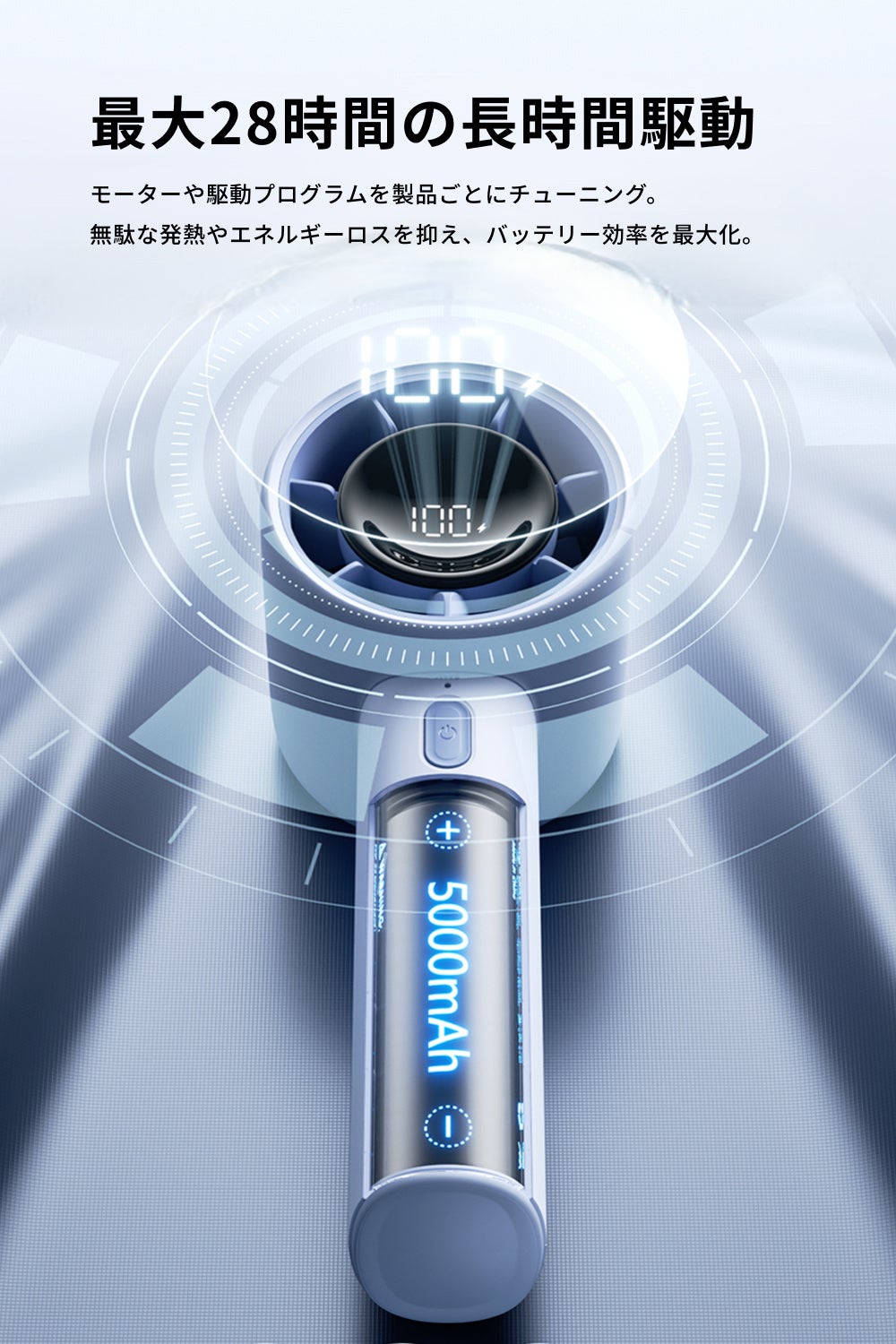 Handheld Fan 10 Sは、9枚のタービンブレードが強く優しい風を生み出します。バッグに収まりやすい軽量コンパクトデザインながら、最大28時間の長時間駆動を実現しました。お求めやすい価格ながら、風量、コンパクト性、長時間駆動、安全保護機能を搭載したスタンダードモデルです。