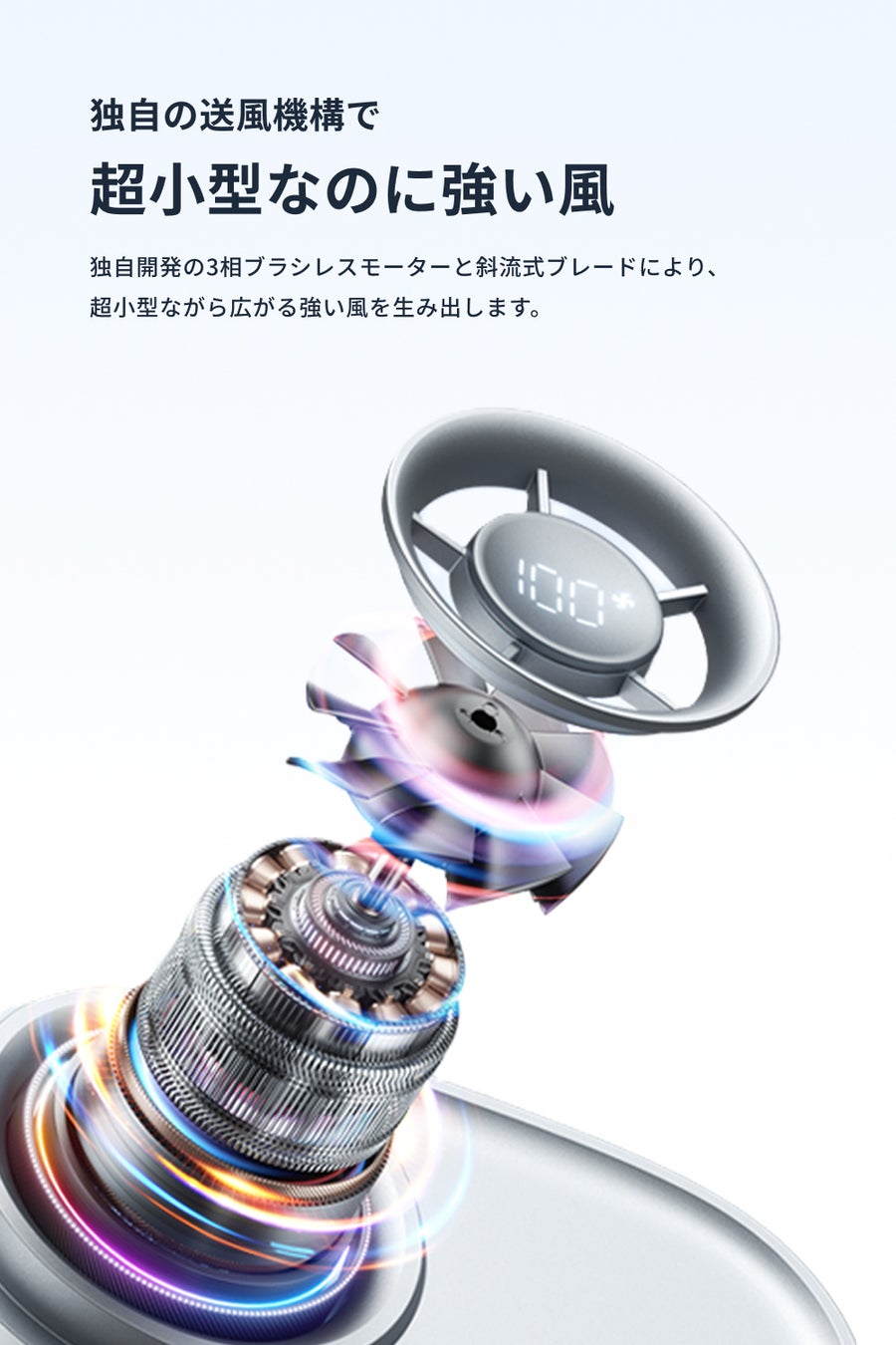 独自開発の3相ブラシレスモーターとタービンブレード(羽根)により、超小型ながら広がる強い風を生み出します。