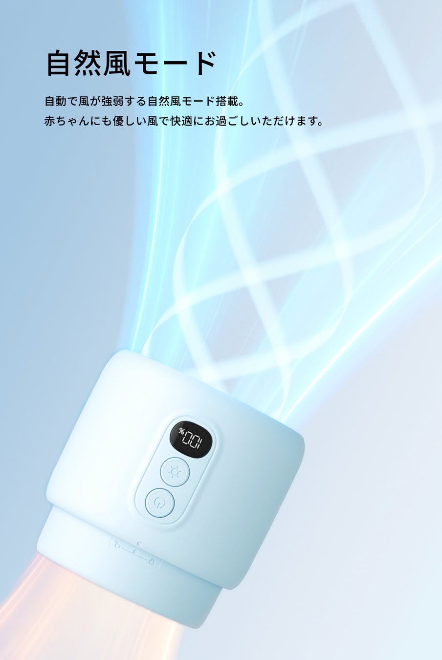 自動で風が強弱する自然風モード搭載。赤ちゃんにも優しい風で快適にお過ごしいただけます。また静音設計で赤ちゃんの眠りを妨げません。