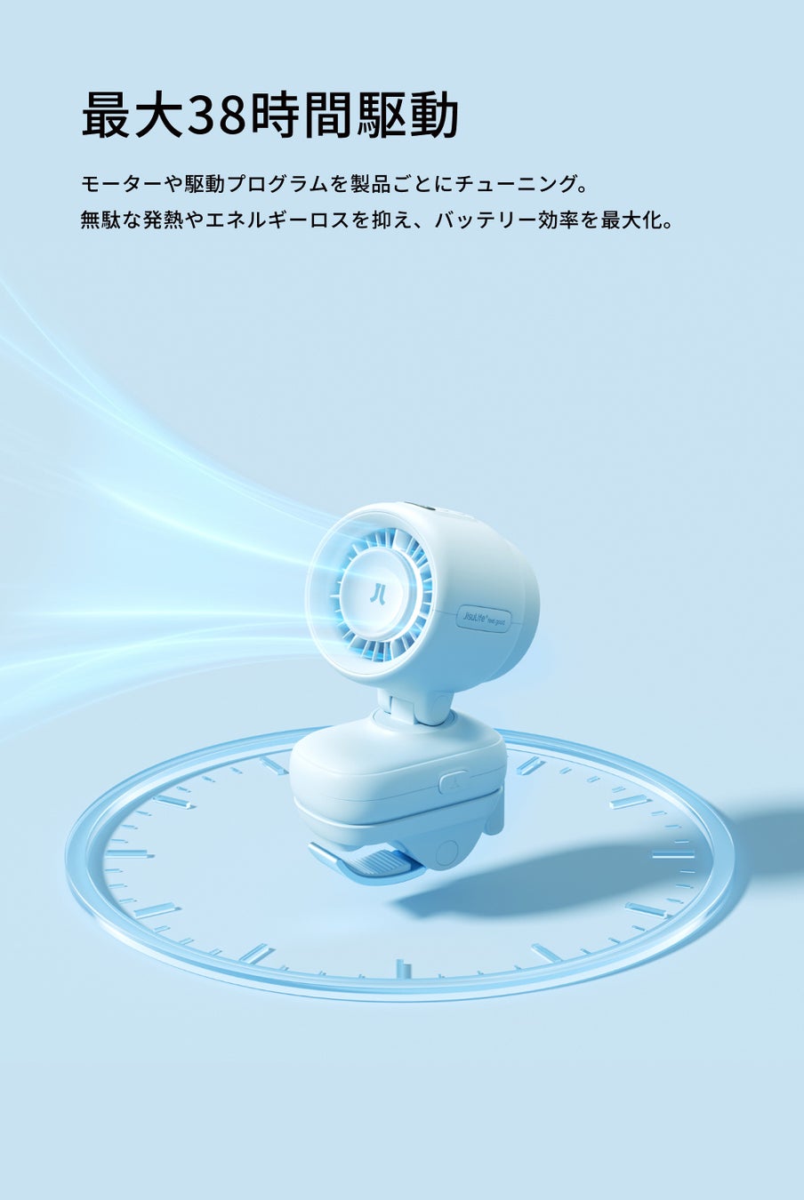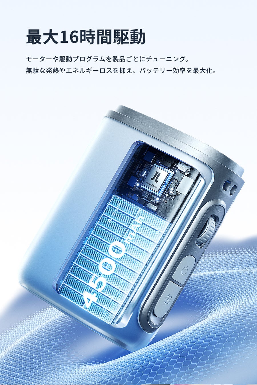製品ごとに異なる羽根の空気抵抗に合わせて、モーターや駆動プログラムを個別にチューニング。無駄な発熱やエネルギーロスを抑え、バッテリー効率を最大化。