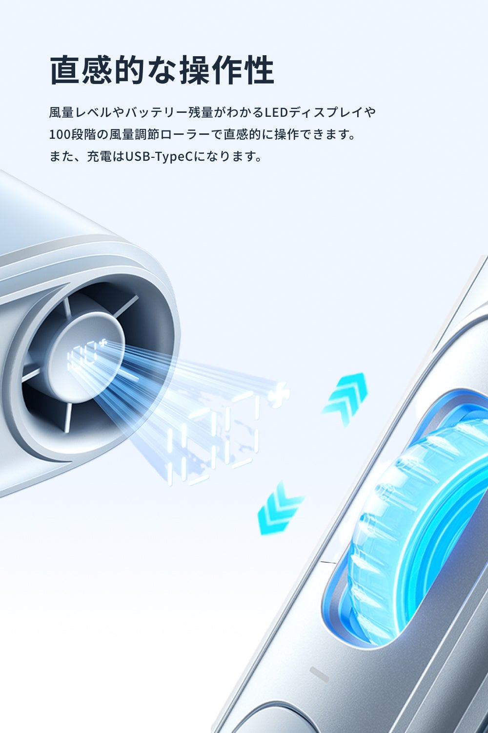 風量レベルやバッテリー残量がわかるLEDディスプレイや100段階の風量調節ローラーで直感的に操作できます。また、充電はUSB-TypeCになります。