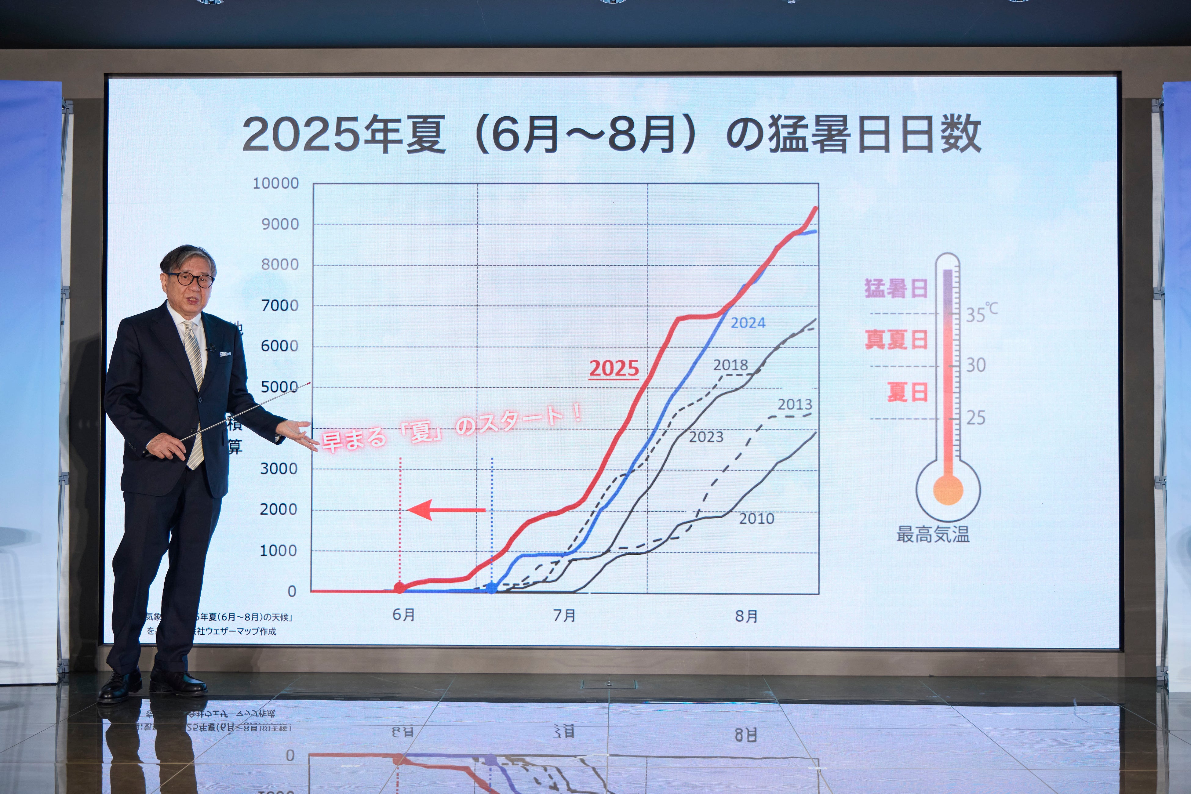 プレゼンテーション後には、株式会社ウェザーマップ会長の気象予報士・森田 正光氏をゲストに迎えたトークセッションを実施しました。森田氏は「異常気象が続き、気候変動の時代になってきている」と語り、近年の日本の夏の気温上昇と都市型熱中症リスクについて解説。科学的データに基づく暑さ対策の新常識を提示しました。