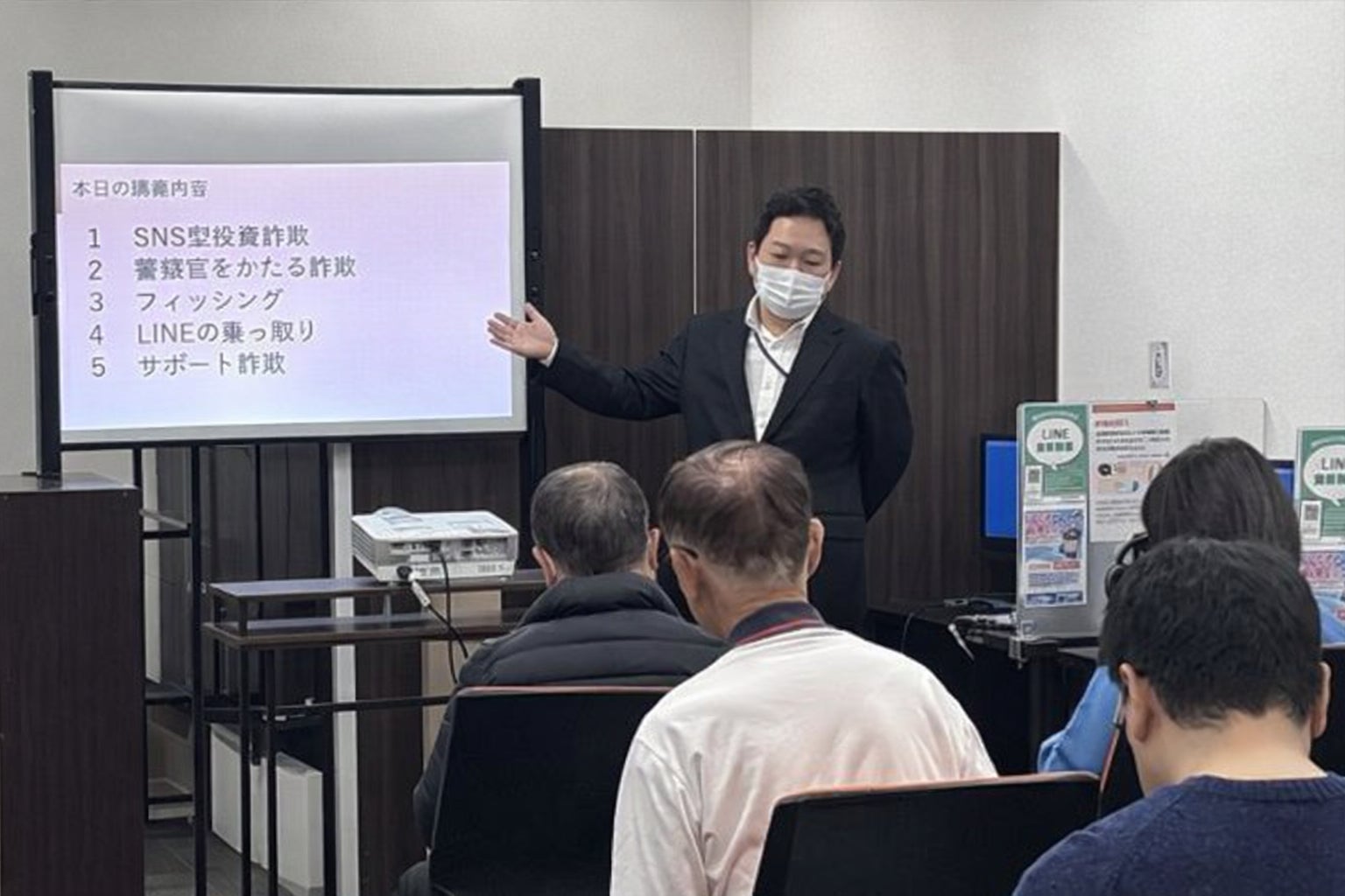 セミナー講師は、警視庁サイバーセキュリティ対策本部の方に担当いただき、投資詐欺・フィッシング・LINE乗っ取り・サポート詐欺など、巧妙化する最近のSNS・インターネット詐欺の手口についての解説と、自分自身でできる防犯対策についてお話しいただきました。