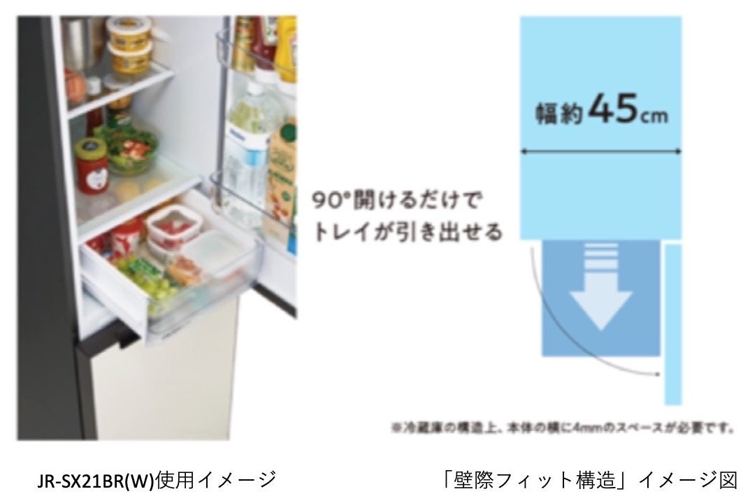 208L冷凍冷蔵庫(JR-SX21BR/BL、JR-SX21T)『freemo』は、幅約45㎝のスリムボディながらも、74L収納可能な「ジャイアントフリーザー」を装備した製品です。壁際にピッタリ設置しても90°ドア開閉で中身の出し入れが可能な構造を採用し、置き場所を選ばず自在に設置いただけます。