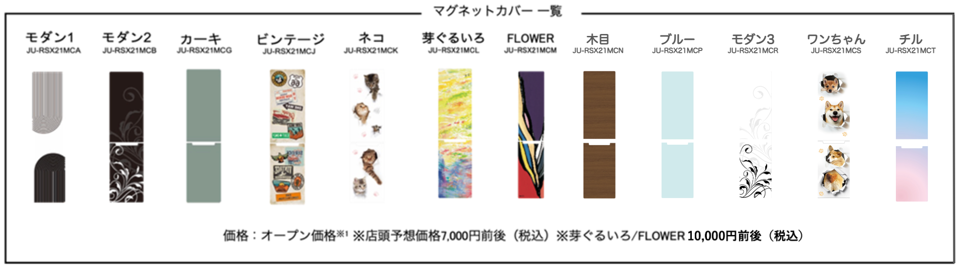 ドア面を彩る「マグネットカバー」は、白と黒を基調にした「モダン」や、アメリカンなステッカーでデコレーションされた「ビンテージ」、淡いグラデーションの「チル」など12種類に今回の3種類を加え、合計15種類となります。