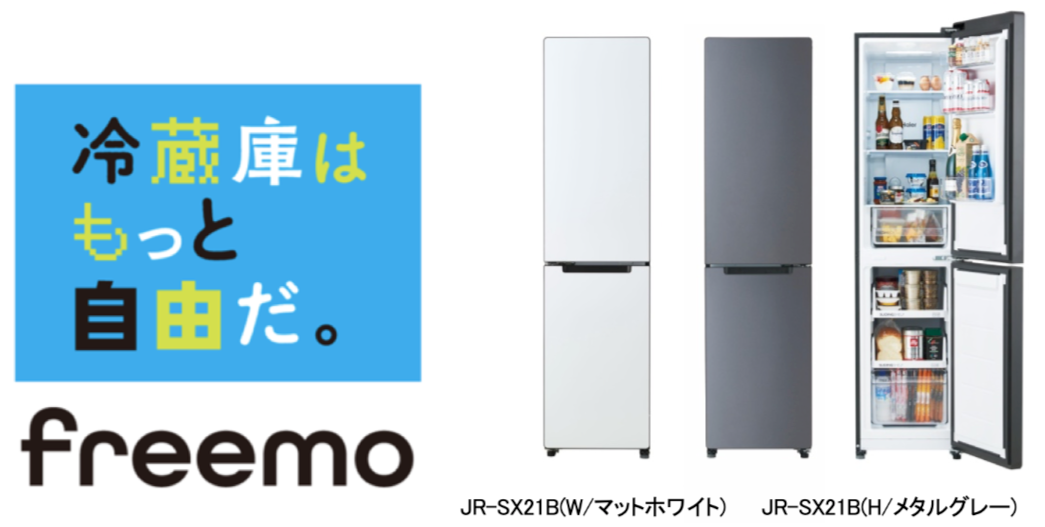 208L冷凍冷蔵庫(JR-SX21BR/BL、JR-SX21T)『freemo』は、「冷蔵庫はもっと自由だ。」というコンセプトのもと、基本性能や使いやすさを重視しながらも、プライベート空間で快適さや楽しさを感じていただける製品です。ドア面を専用の「マグネットカバー」でデコレーションすることが可能な本製品は、自分好みにプライベート空間を演出して楽しむことができるため、インテリアにこだわりをもったお客様を中心に好評をいただいております。