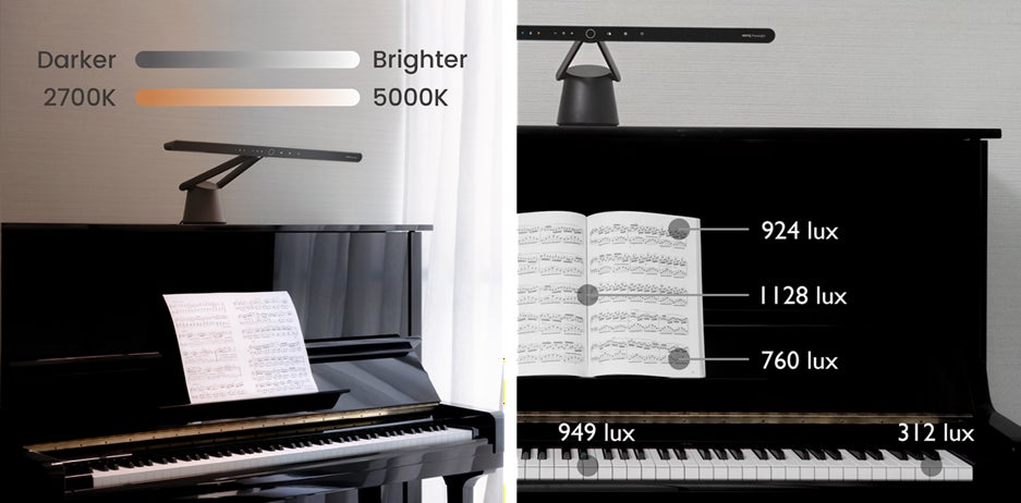コンサートホールの照明基準を満たす高照度設計により、楽譜面で500ルクス以上、照度比1.5の均一な明るさと、88鍵盤すべてに300ルクス以上の光を確保。さらに両モデルともにANSI規格に準拠した明るさ・色温度調整機能を搭載し、PianoLight®は15段階/6段階(2700K-5000K)、PianoLight® Grandは14段階/7段階(2700K~5300K)に対応し、演奏やレッスンなどシーンに応じた照明環境を実現します。