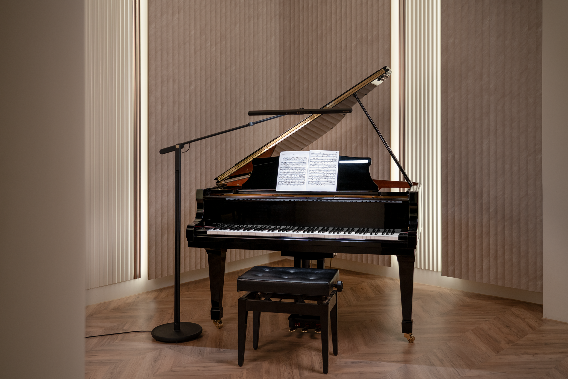 2つに制御された光が、異なる距離や角度にある楽譜とピアノ鍵盤を同時に照らします。これにより、それぞれのエリアに適した明るさをバランスよく確保し、まぶしさや目の疲れを軽減。視認性と快適性を高めながら、空間全体の明るさも向上させるので、アンサンブルも快適に演奏できます。