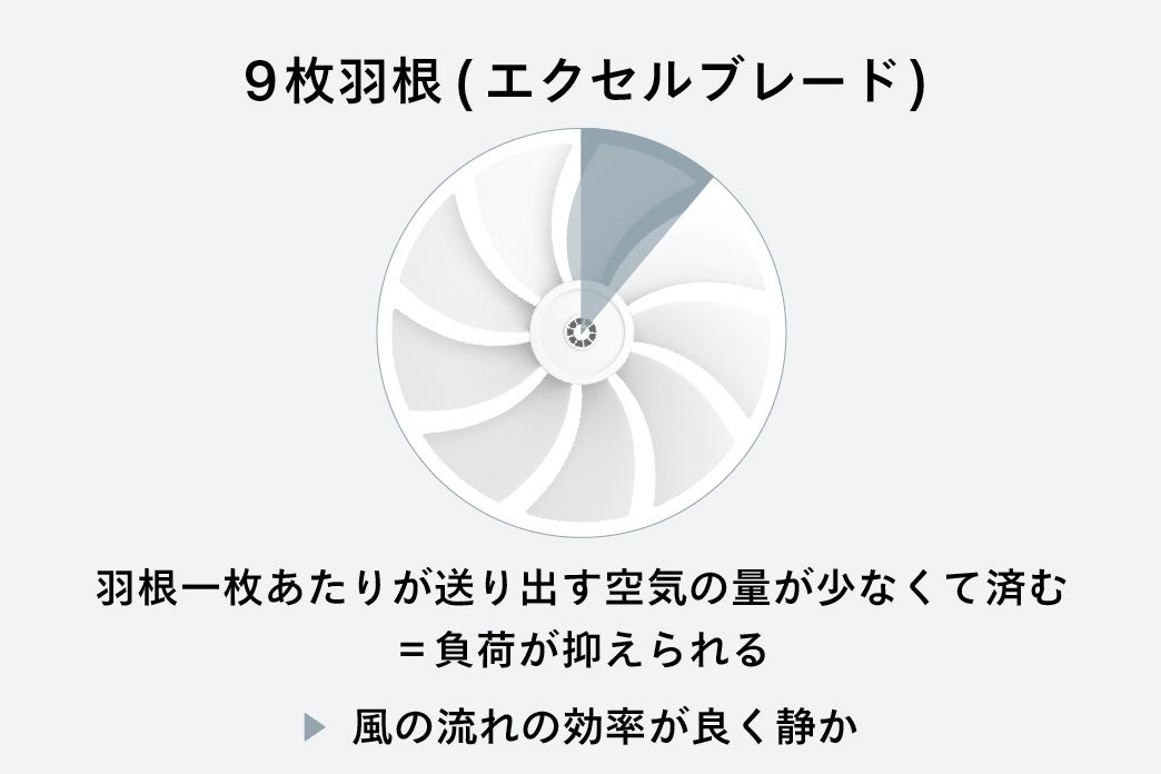 「エクセルブレード」は、ジェットエンジンの羽根を設計する専門企業ターボブレード社と共同開発し、で効率的に風を送るため、羽根の先端から根元ま最適な断面形状・角度となるよう精密に設計しています。抵抗を抑えて空気をスムーズに流し、騒音の発生を低減しています。また、羽根枚数を増やすことで、羽根一枚あたりの負荷を分散しています。これらの送風効率の高い設計により、大風量と静音性※を両立しています。