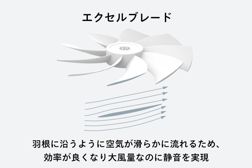 本製品は、「エクセルフローガード」と「エクセルブレード」を組み合わせ、運転音を抑えて風をより遠くまで届けることができ、一年を通じて快適な室内空間を提供します。