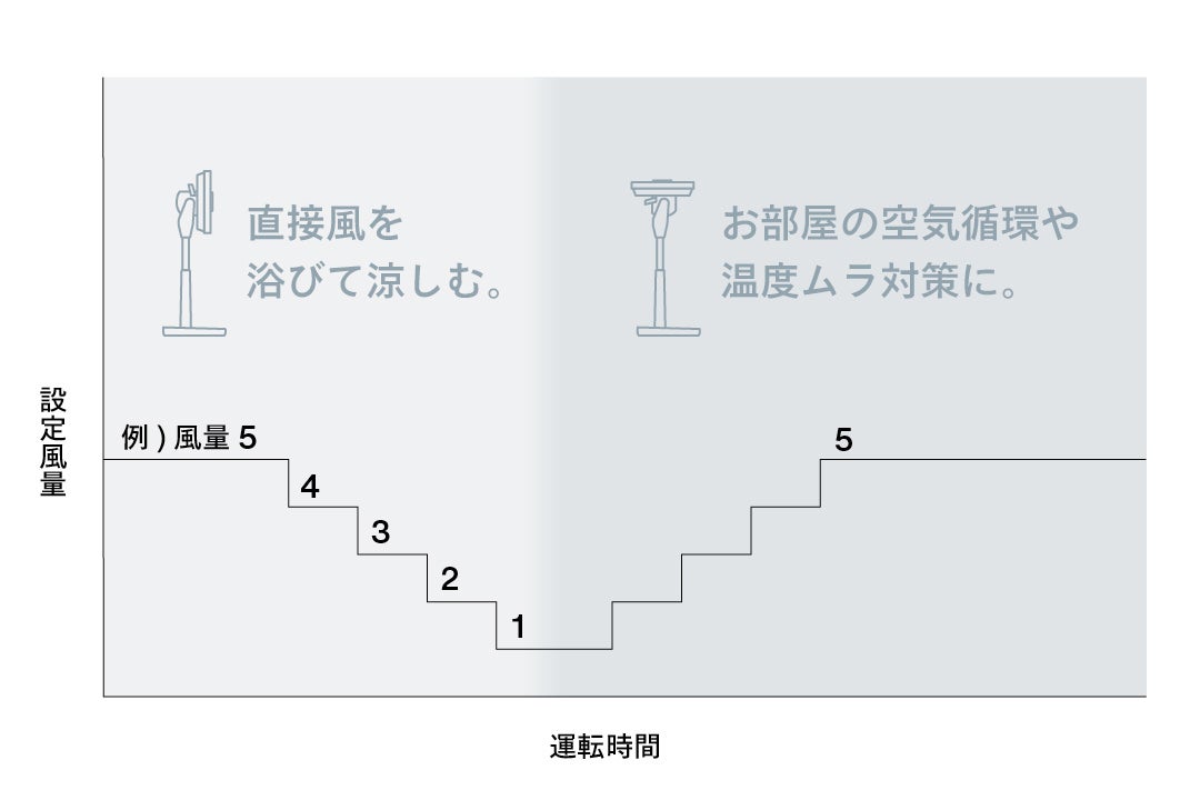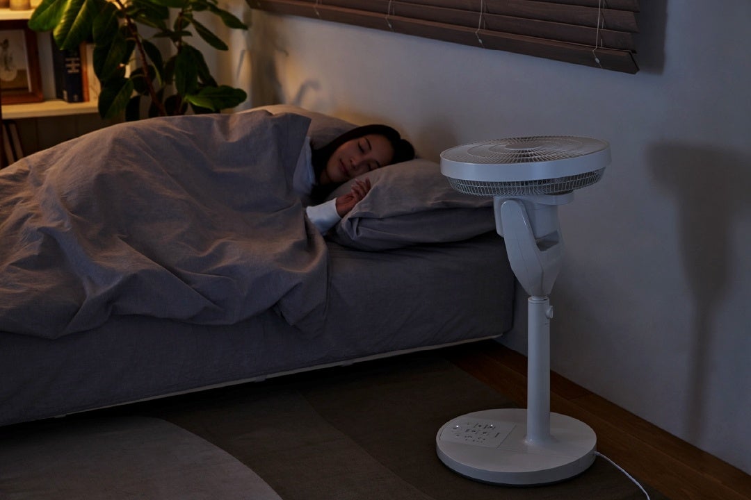 EF-J951Wのおやすみ空間モードは、就寝中の風向と風量を自動制御する機能です。モードを設定すると、風量が段階的に下がり、送風方向が真上に向きます。その後、徐々に風量を上げながらサーキュレーション​運転に切り替わり、天井付近にたまった空気を循環させて温度のムラを抑制します。風が体に直接当たり続けないため、エアコン併用時にも冷えすぎることなく快適な眠りをサポートします。