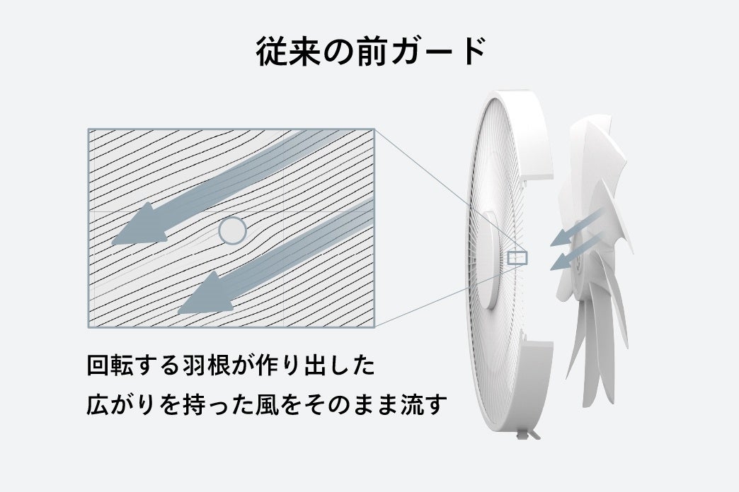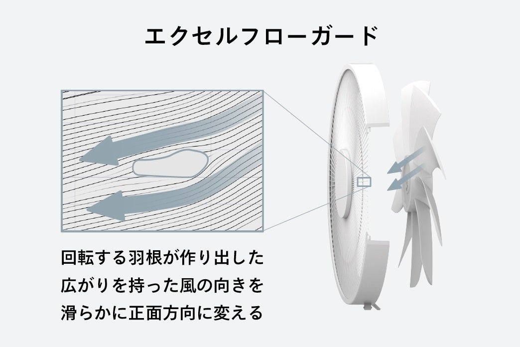 一方で、”静かだが風の強さが物足りない”という声も寄せられていました。これを受けて、本製品では前ガードの設計を見直し、新たに「エクセルフローガード」を開発しました。「エクセルフローガード」は、ジェットエンジンの“静翼※2”から着想を得て設計し、空気抵抗を抑えながら風の向きを整えます。これにより、風の直進性が高まり、運転音を上げずに風速が従来機種と比較して約20%※1向上しました。