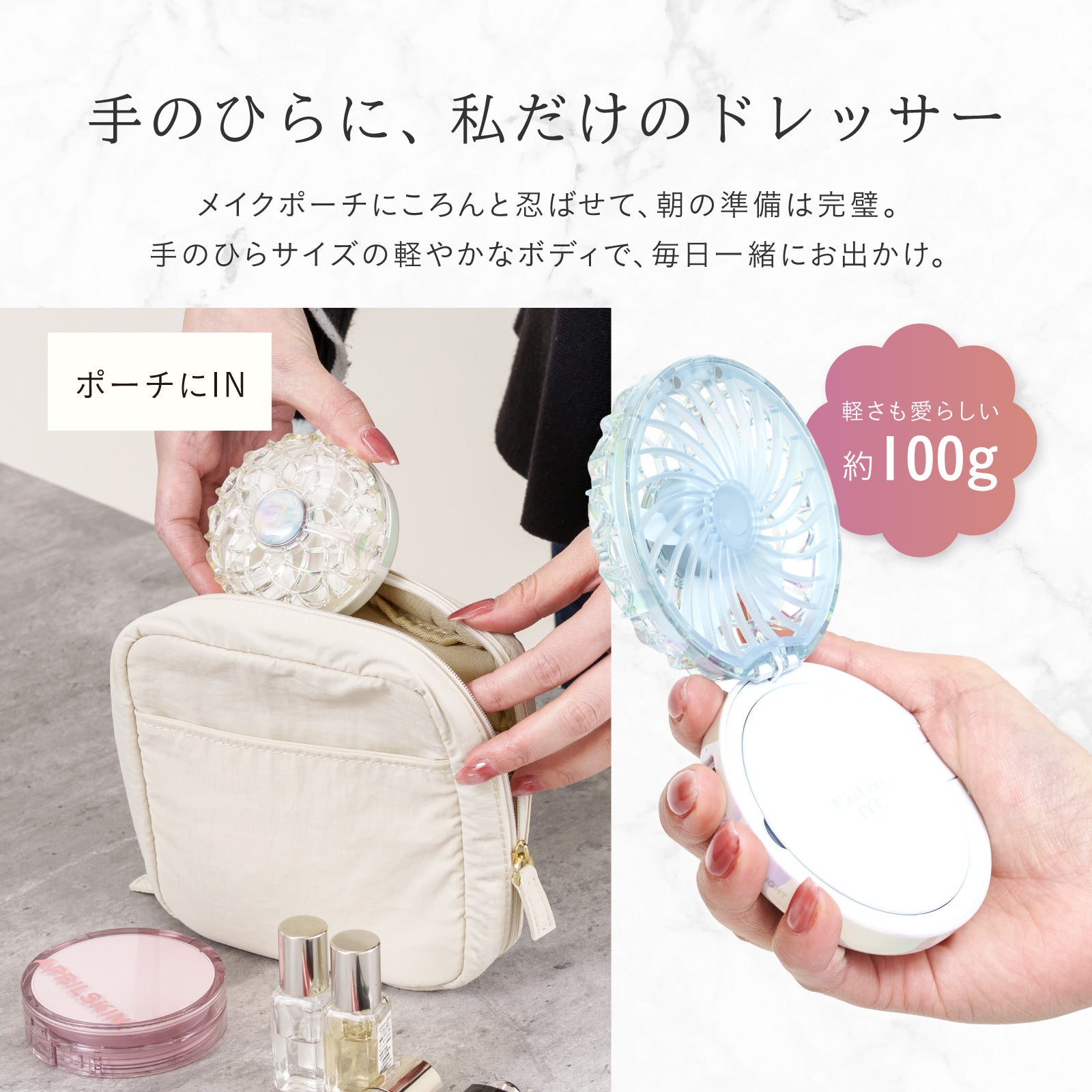 4月の突然の暑さによる汗・メイク崩れ対策に。通勤・外回り・移動中でも、ポーチに入る約100gのコンパクト設計「ミラハナファン」が、デパコスのようなデザインで、初夏のお直し時間を涼しく快適に変えます。