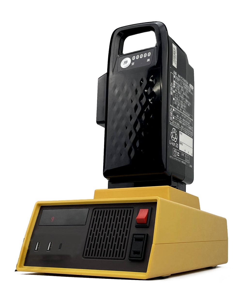 『チャリパワー』は保管スペースを取らず、緊急時に自転車で避難する際も持ち運びやすいコンパクトサイズ。本体重量1.25㎏。